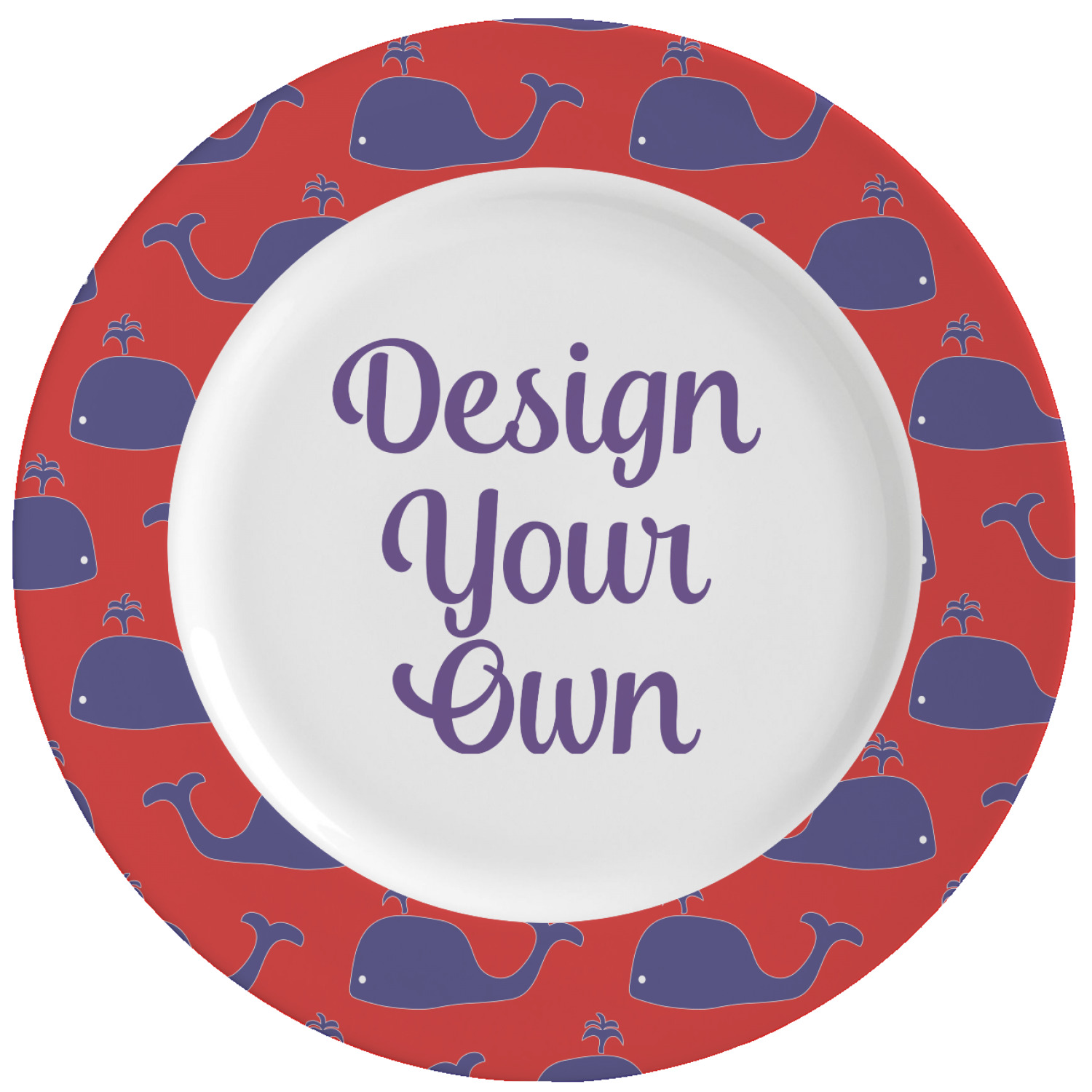 With this custom dinner plate, your have the option of personalizing the rim with an attractive pattern, and then displaying a name, graphic, or text in the center of the plate, against a white background. The exterior of this plate is also the same classic, white color. A glaze coats your plate, making your vividly colored design seem even more vibrant.