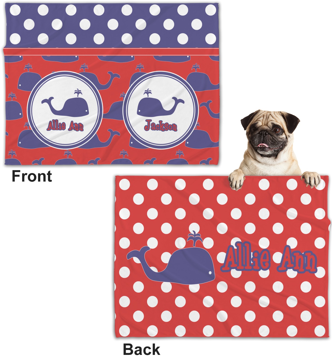 These dog blankets are crafted from a gentle, soft-to-the-touch, minky material. We print your customizations, either matching or differing, on both the top and underside of the blanket. These personalized dog blankets are available in two sizes: regular and large. Our regular size, at 40" x 30", accommodates small and some medium size dogs. At 60" x 50", our large dog blanket is a better fit for bigger breeds. Though specialized for dogs, these blankets still make a thoughtful gift for your favorite feline, or any other pet in mind!