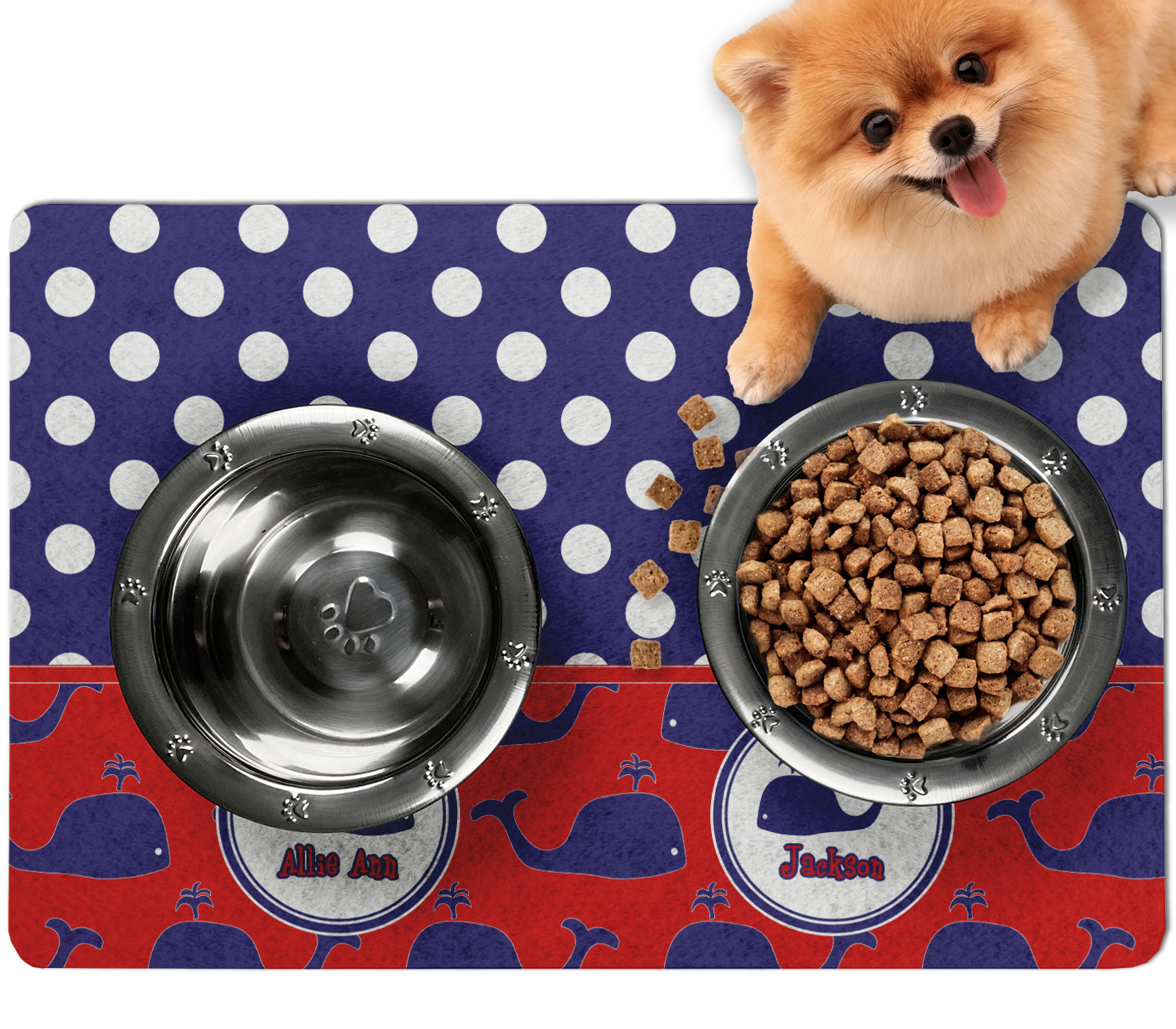 This dog bowl mat, fabricated from polyester, proudly displays your customized design on its top, while its bottom includes a non-slip rubber. This feature allows it to remain firmly in place, even when your dog spills his/her water. With 3 sizes available (18" x 12", 24" x 18", 30" x 24"), the pet food mat has ample space for both a food and water bowl for any sized dogs. Though specified for dogs' use, these mats are also a splendid option for cats.