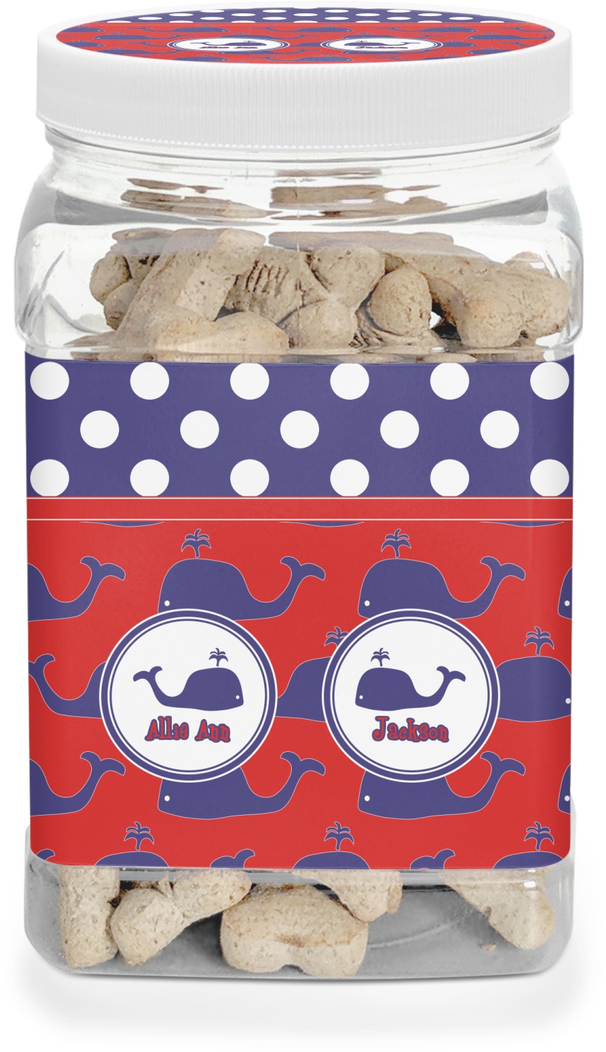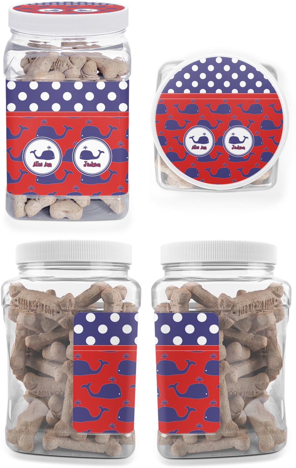 This half gallon jar, made from a sturdy plastic, is the perfect way to keep treats from any naughty pet paws, while still keeping them ready on hand for when your pup performs an impressive trick. This dog cookie jar features a screw-on, white lid that displays your personalized design on a vinyl sticker. We apply another customized sticker that wraps around the front and sides of the jar. Our dog treat jar also has indentations on the rear ends of the sides, which allows for convenient handling, and its square frame allows for easy storage.