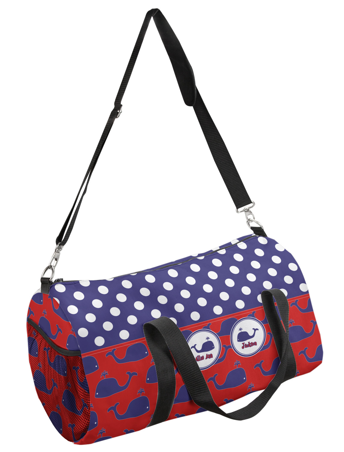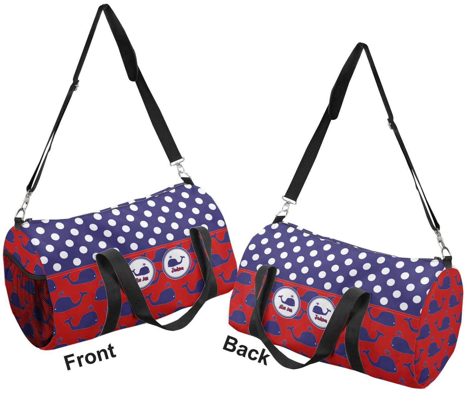 This duffle is a sturdy bag made of a canvas material. It comes in two sizes: Small (19"W x 9.5"H x 9.5"D) and Large (23"W x 12"H x 12"D). The bag is a cylindrical shape with a black adjustable strap and two handles. On one side is an elastic pouch to put a waterbottle or other small item. Your product will be sublimated with your design and is able to be designed on the front, back, and sides. Be sure to remember that the straps may cut into parts of your design if you upload your own artwork.