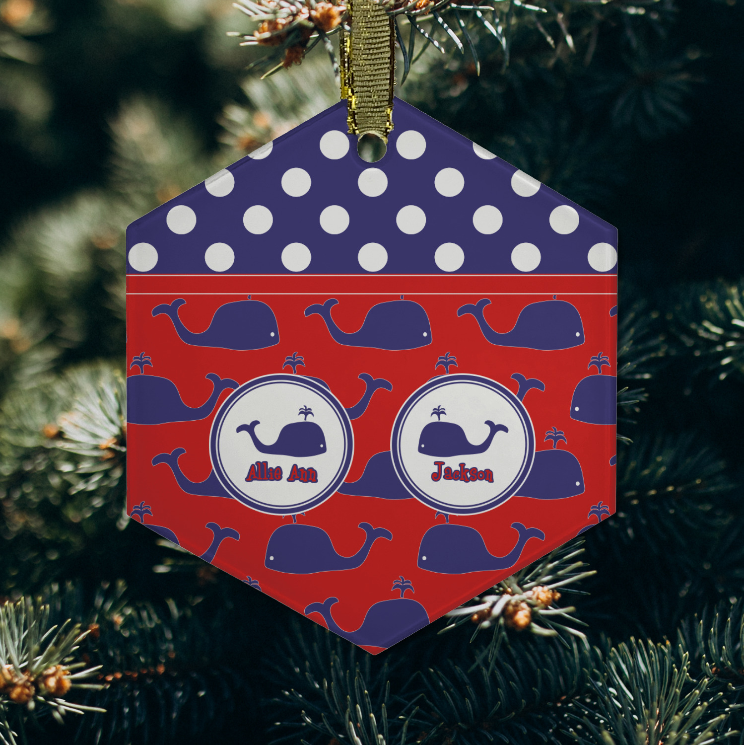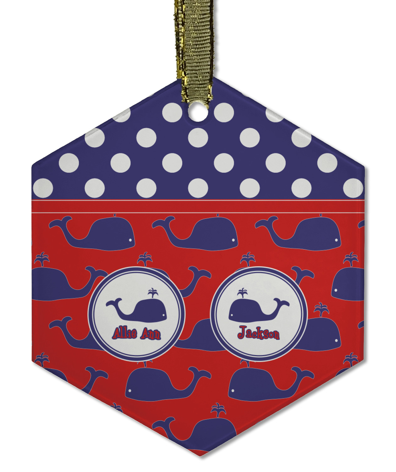 Each of our flat glass ornaments come with a gold string to hang on your Christmas tree with style! We offer two different shapes - flat, round ball or a hexagon. Both glass ornaments have a frosted coating on one side where we print your design while the other side is a clear gloss to give your personalized ornament a sheen finish. Our flat round glass ornament is approximately 3.5" x 3.5" while the flat hexagon ornaments are approximately 3.5" x 3".