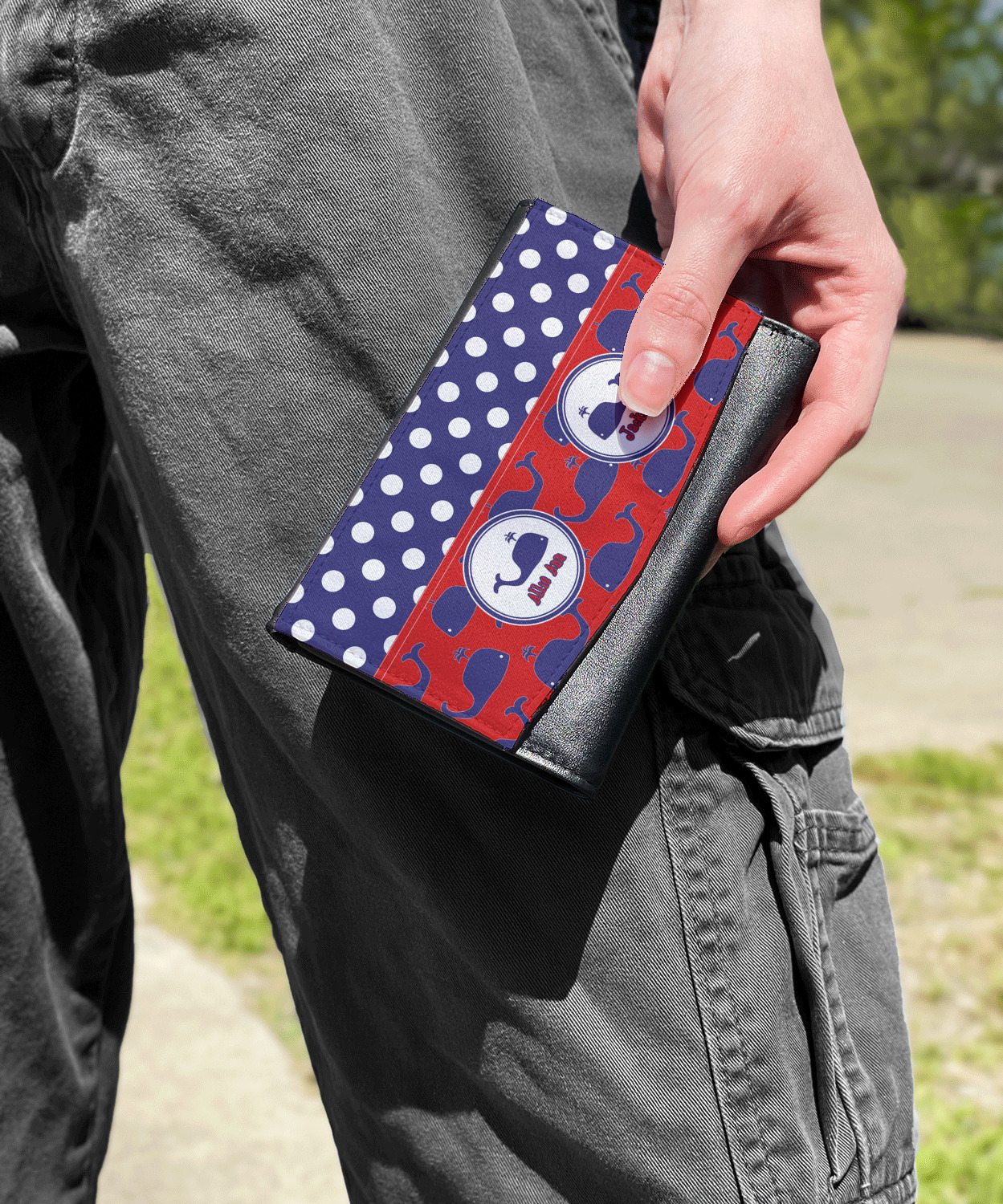 The compact size of this wallet - 5.5in wide, 3.5in tall and 0.75in thick when folded - makes it perfect to hold in hand and small enough to fit in a clutch or a normal size purse. The outside flap is customized with your choice of artwork and closes with a snap closure - with two different snaps to allow it to be adjusted when storing more items - to securely fasten the flap.