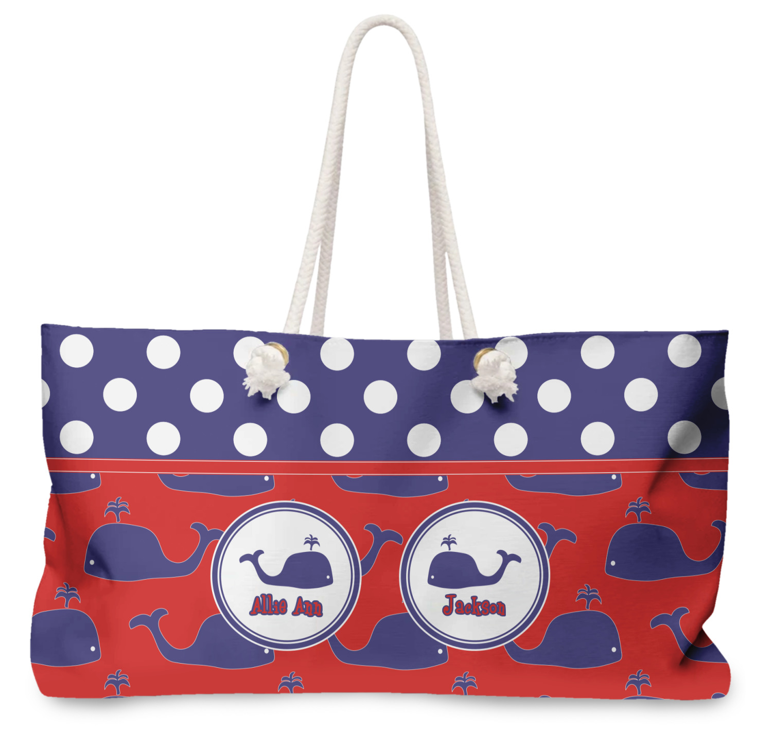 Our oversized weekender tote with rope handles is perfect for your weekend at the beach or on the town. This large tote are 24" W X 13" H, with a 5" gusset and a 27" thick rope handles with a knot that is put through a grommeted brass hole.