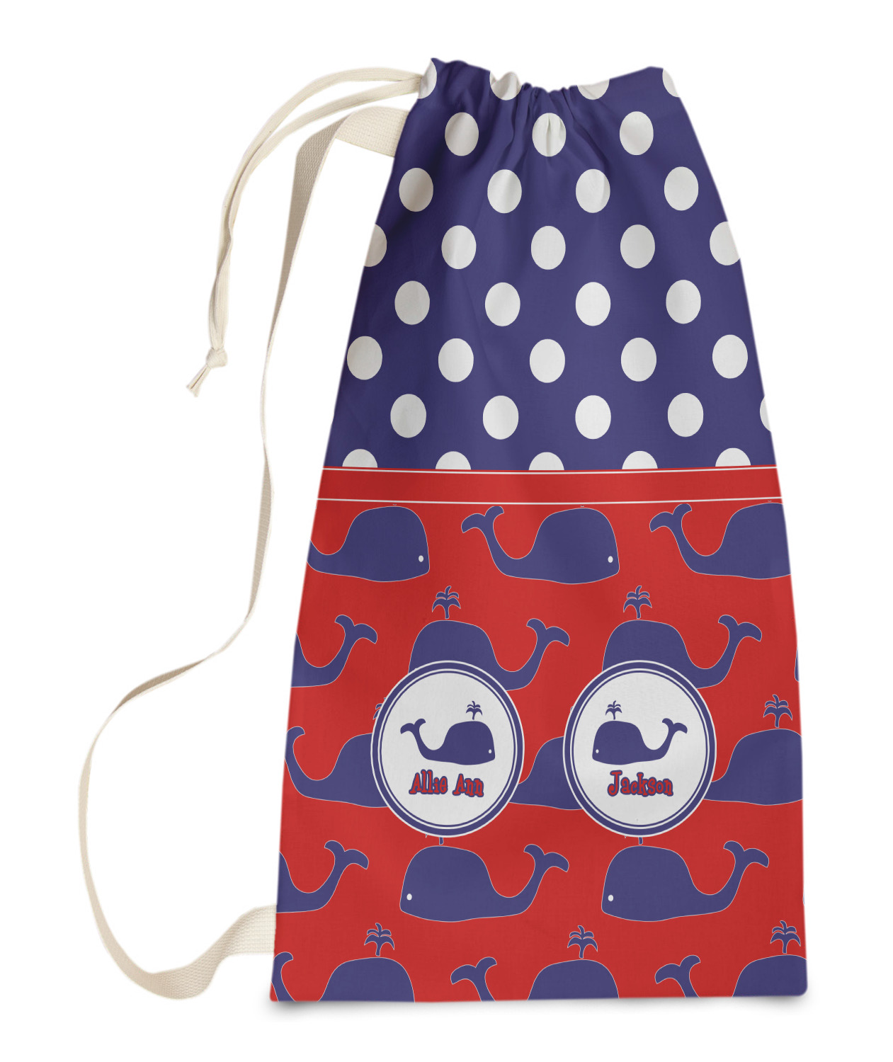 Carry your laundry in style with these customized laundry bags. Available in two sizes, featuring a natural colored woven strap and a cinch cord, these bags hold a lot of clothes or anything else you want to fit in them.