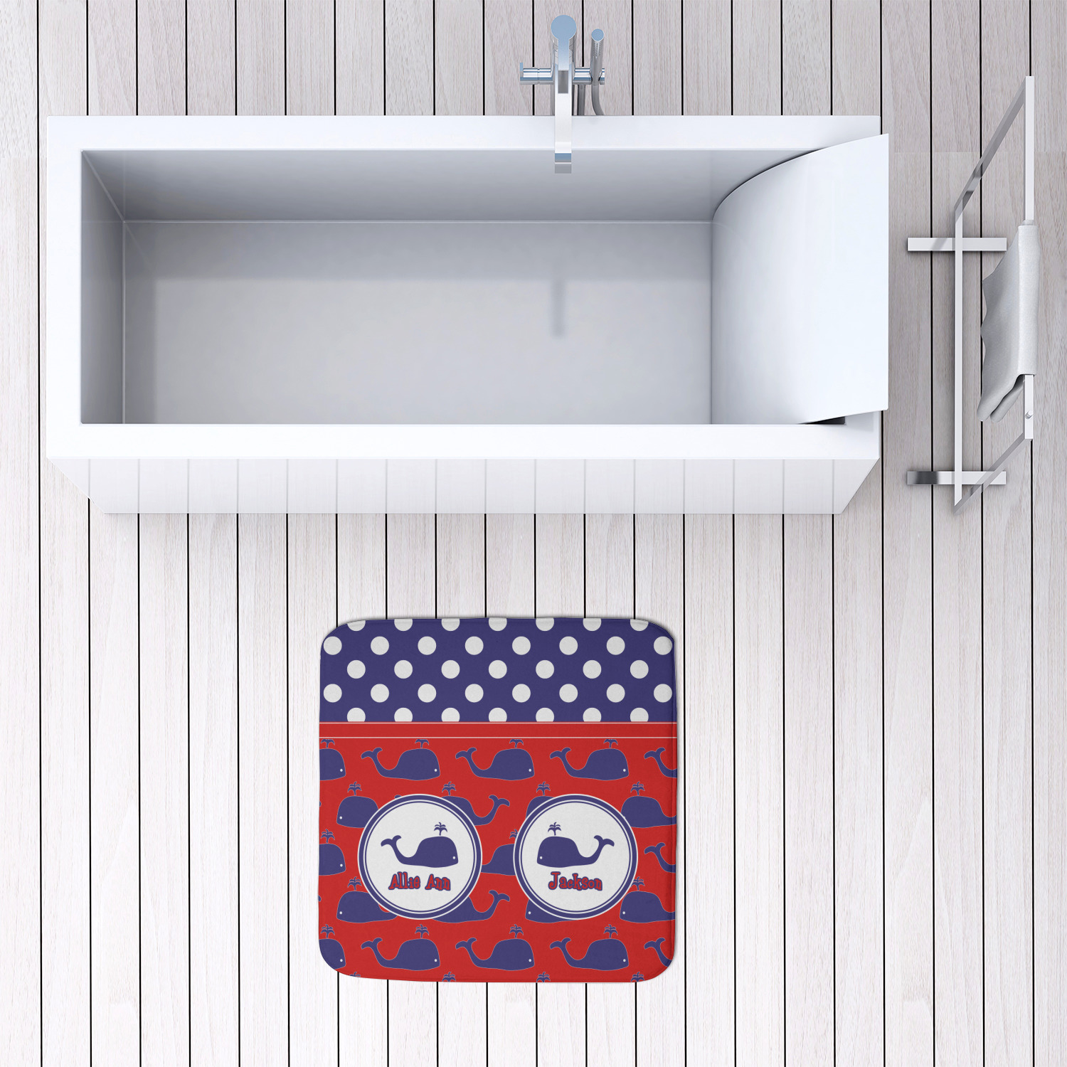 We offer this custom bath mat in four different sizes, so that you can choose the proper size for your bathroom and shower space. We suggest measuring the area before so that you can make an informed purchase. The four sizes are as follows: 24 by 17 inches, 34 by 21 inches, 48 by 36 inches, and 48 by 48 inches.