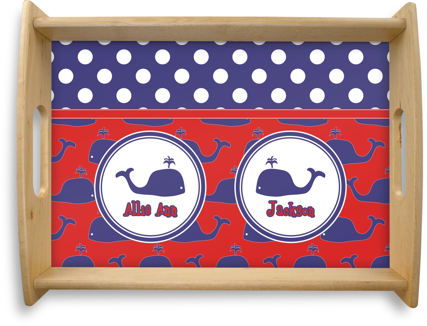 This serving tray with handles features square edges and two rounded sides, creating a very modern look. Each side is fabricated from a beautifully cut, natural wood. The bottom of the interior of the tray displays your customized design in bright, vibrant color. The tray is sold in both a black color and a natural wood look. Each variation of the wood serving tray has two sizes: Small, which is 14" x 10" x 2.25", and Large, which is 19.5" x 13.5" x 2.75".
