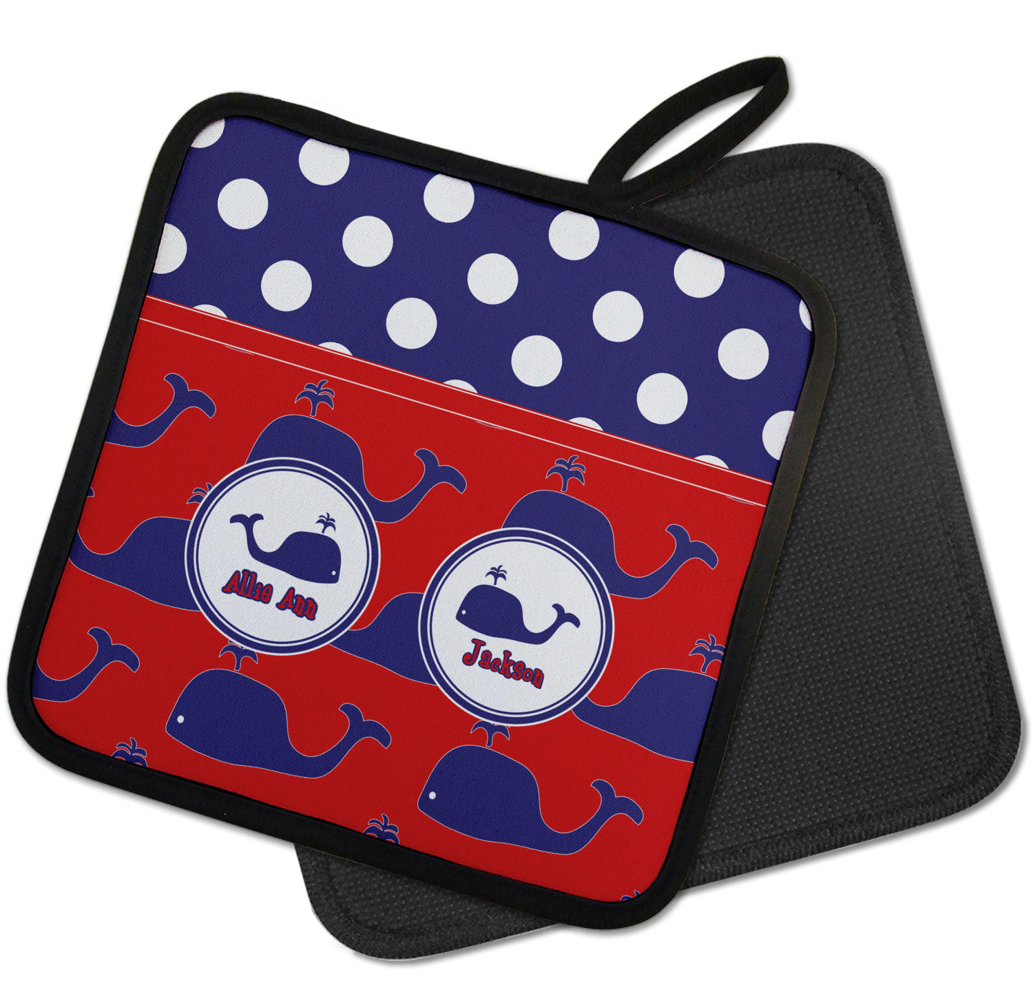 Our personalized pot holders feature a neoprene front that displays your personalization in vibrant colors. The backing of the hot pot holder is rubberized; the textured backing allows you to have a great grip when using this custom pot holder. The two materials are joined with a sleek, black trim, and the holder also includes an attached loop for hanging and storage. The pot holder is approximately 8.75 inches by 8.75 inches and 0.25 inches tall, while the fabric loop is 2.5 inches long. You can purchase a kitchen pot holder by itself or as a set of 2. We also offer a set including one pot holder and one oven mitt.