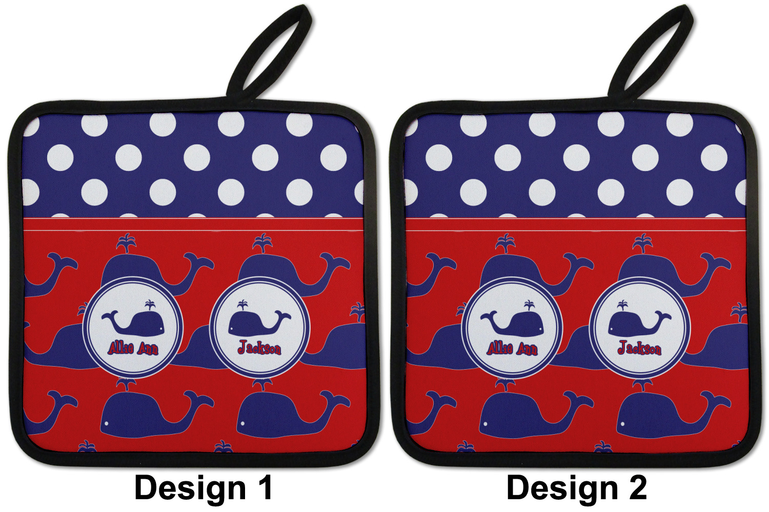 Our personalized pot holders feature a neoprene front that displays your personalization in vibrant colors. The backing of the hot pot holder is rubberized; the textured backing allows you to have a great grip when using this custom pot holder. The two materials are joined with a sleek, black trim, and the holder also includes an attached loop for hanging and storage. The pot holder is approximately 8.75 inches by 8.75 inches and 0.25 inches tall, while the fabric loop is 2.5 inches long. You can purchase a kitchen pot holder by itself or as a set of 2. We also offer a set including one pot holder and one oven mitt.