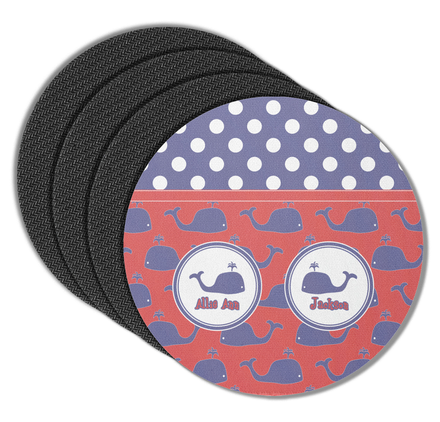 These drink coasters have a smooth, polyester top and a textured, rubber backing on its bottom. The non-slip rubber backing underneath works to keep any spills at bay. At 4 by 4 by 0.25 inches thick, these custom coasters are a suitable size for most drinkware. Your personalization is displayed atop the face of the cup coaster. We sell these rubber coasters in two different shapes: square and round. You can buy each shape as singulars or as a set of 4.