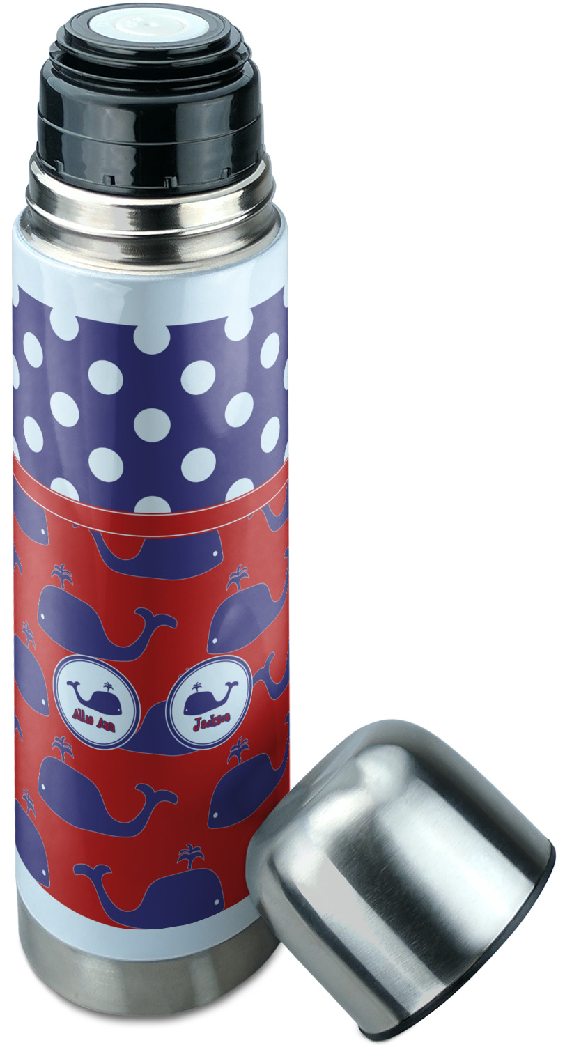 Manufactured from stainless steel, this thermos is built durably and double-walled insulated to preserve the temperature of your drink for hours. It also features a screw off lid that is made to also function as a small cup. Upon unscrewing this part of the thermos bottle, a pop-open, pour feature emerges. This feature allows you to slowly pour your beverage into your lid, ensuring a steady, controlled pour into your lid or other cup. With a capacity of 25 ounces, these large thermoses can hold several servings of your favorite beverage. Your customization is displayed all around the bottle with bright, vibrant color.