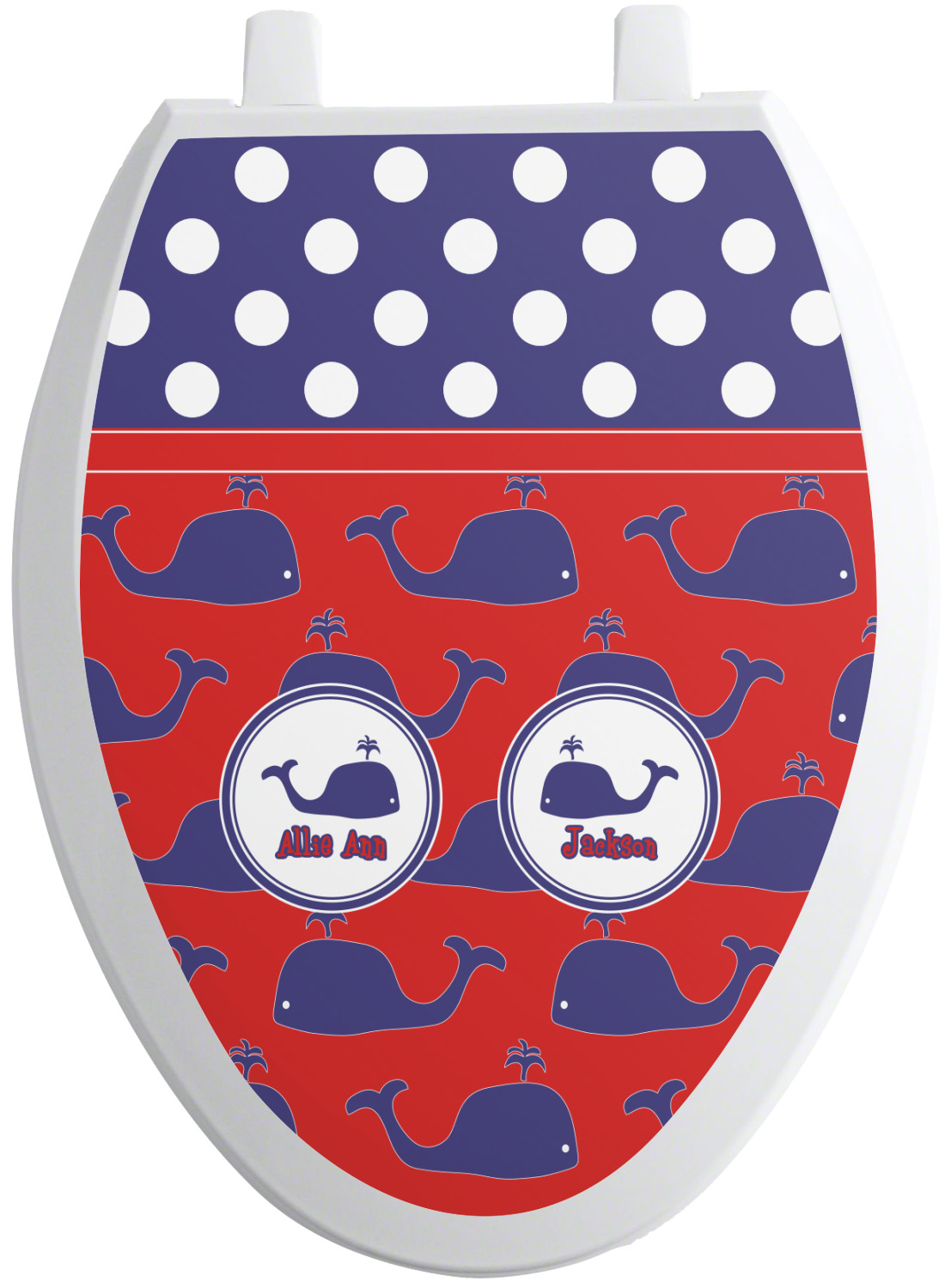 We sell these toilet lid decals in two different shapes to accommodate a wider range of toilet seat shapes. The first shape is our standard, round size, which measures at 13.5 by 12 inches. Our second option is an elongated shape, suited for long toilet seat covers. It measures 15 by 12 inches.