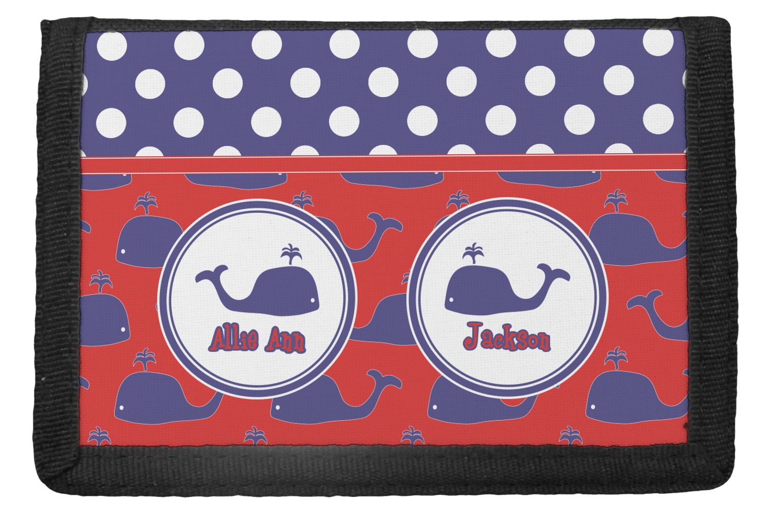 The wallets are black with the design printed on the front flap. You are able to create your design either horizontally OR vertically. They have 4 slots for IDs or credit cards and 1 large slot for cash. The wallet folds in thirds and is tightly secured by velcro. They are great starter wallets for kids or just as a good durable wallet for an adult.