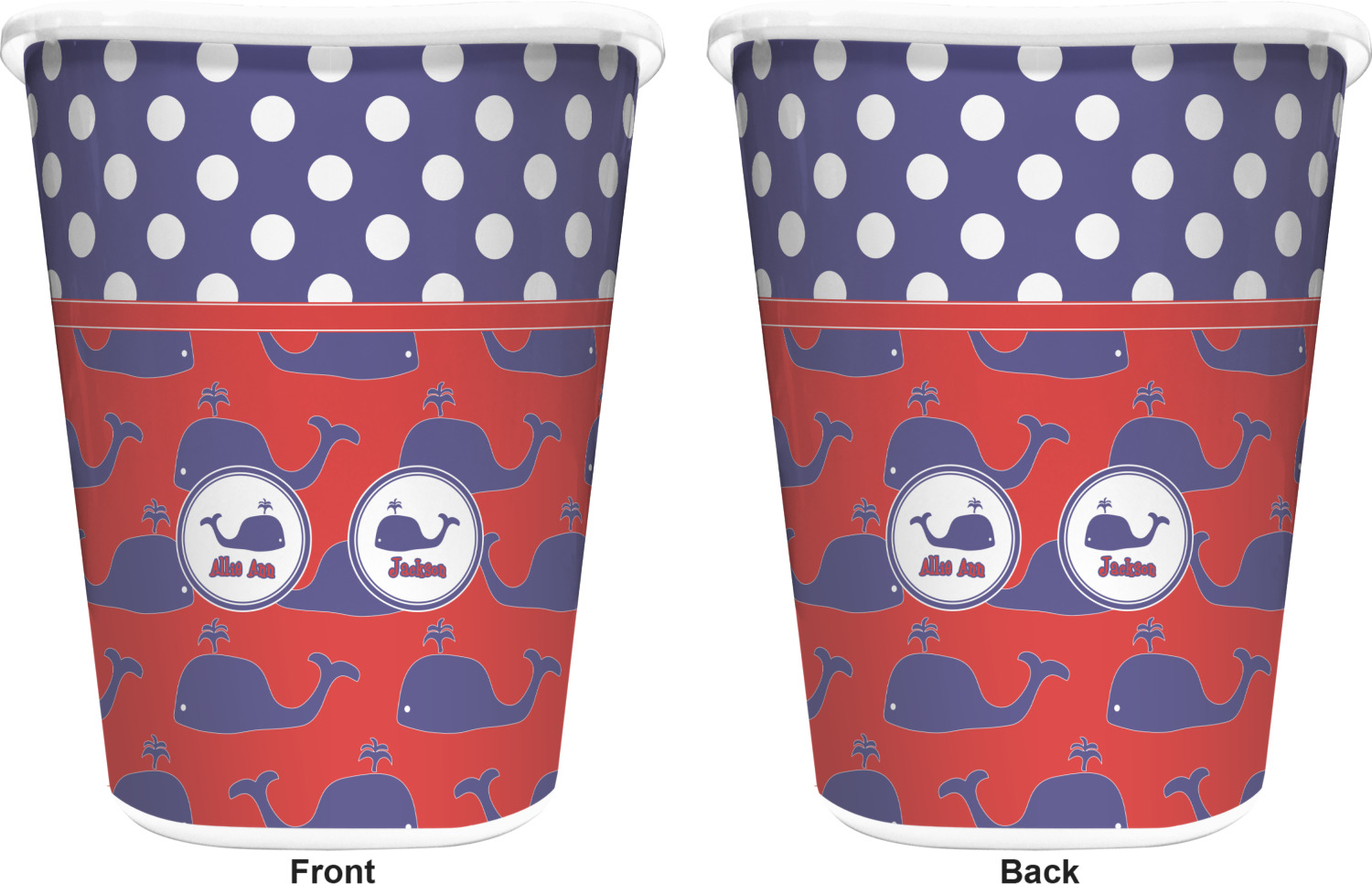 You can choose to purchase these decorative wastebaskets in either a white or a black color that will show on the base and the upper rim. Your customization is printed on a high-gloss, fine-quality vinyl adhesive, and you can choose to either have this adhesive applied to one side only or to both sides. As such, this plastic wastebasket can be single-sided or double-sided, depending on your creative vision. Your customization is printed using durable inks, making the design waterproof and resistant to fading over time.