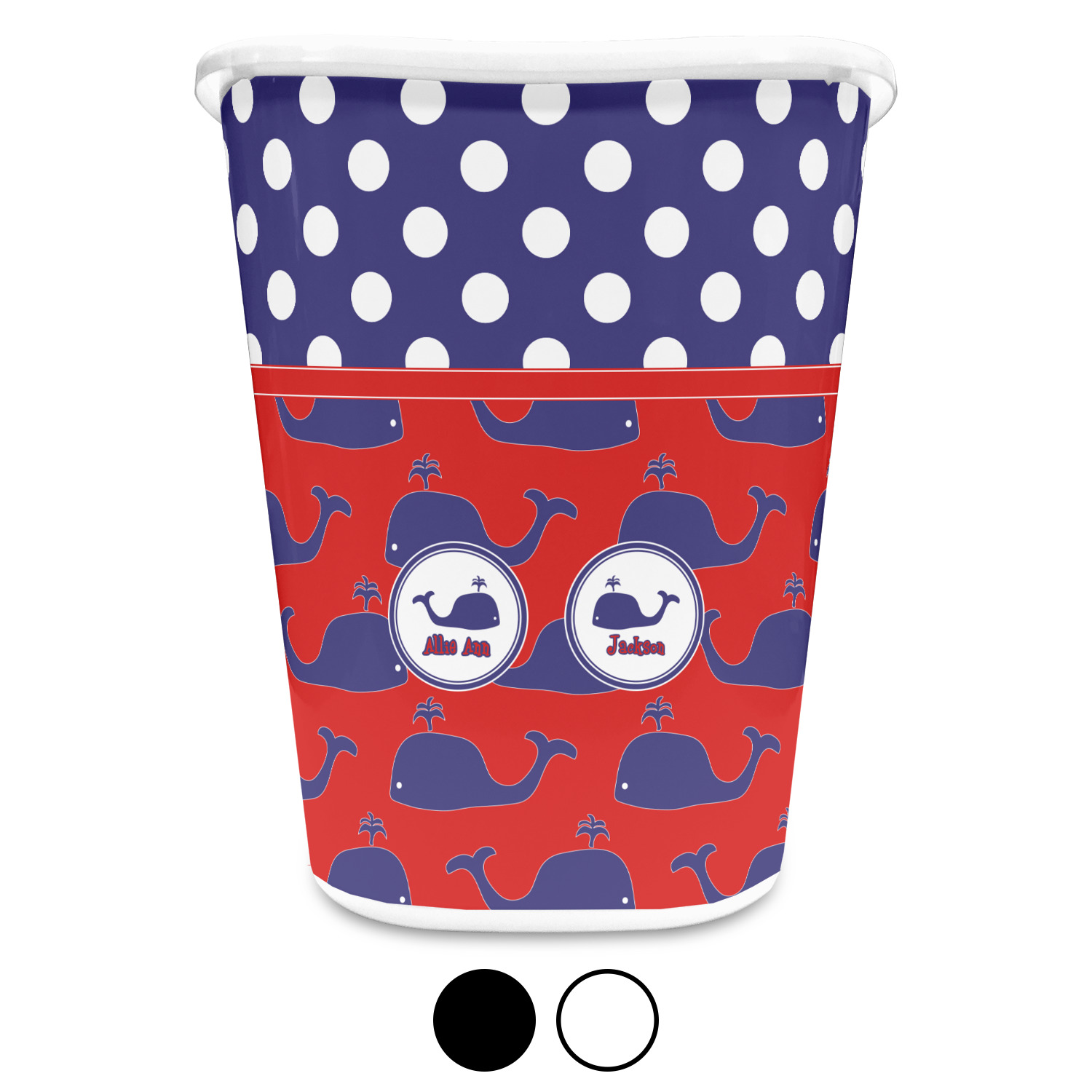 You can choose to purchase these decorative wastebaskets in either a white or a black color that will show on the base and the upper rim. Your customization is printed on a high-gloss, fine-quality vinyl adhesive, and you can choose to either have this adhesive applied to one side only or to both sides. As such, this plastic wastebasket can be single-sided or double-sided, depending on your creative vision. Your customization is printed using durable inks, making the design waterproof and resistant to fading over time.