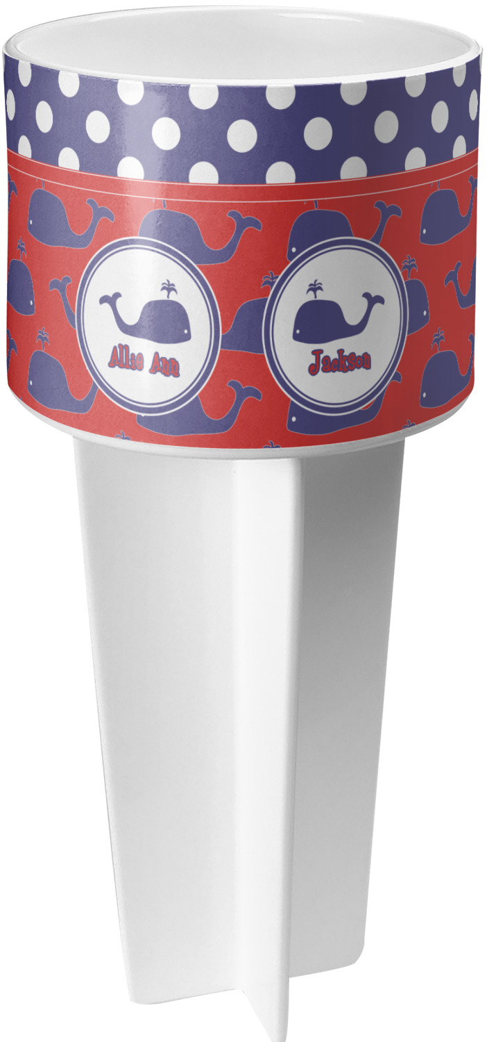 This cup holder has a large stake at its bottom that anchors it to the sand or ground below, while the cup holder rests above the stake. The entire drink holder is made of durable plastic and displays your customization around the cup holder portion. We sell these personalized beach spikers in two different colors: black and white.