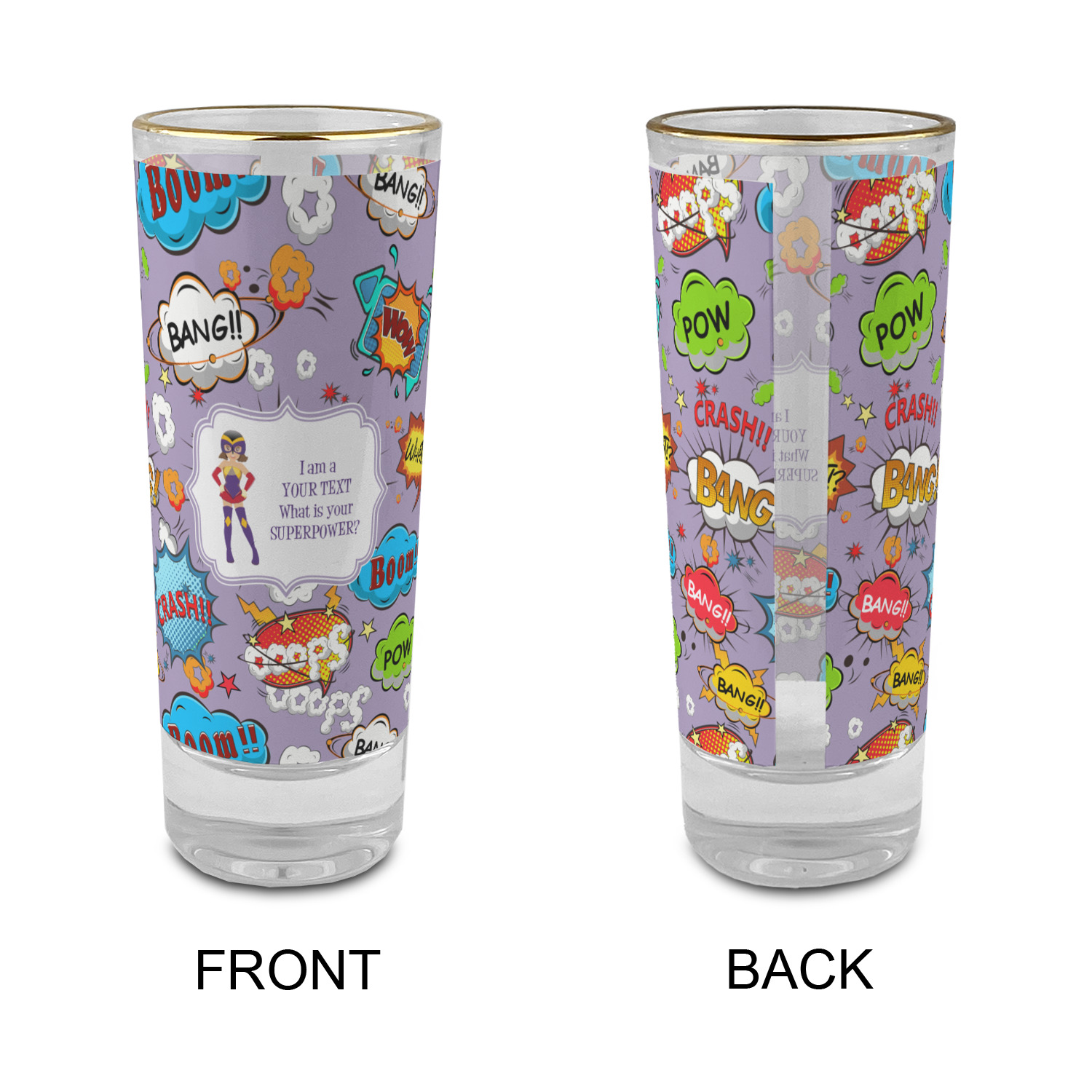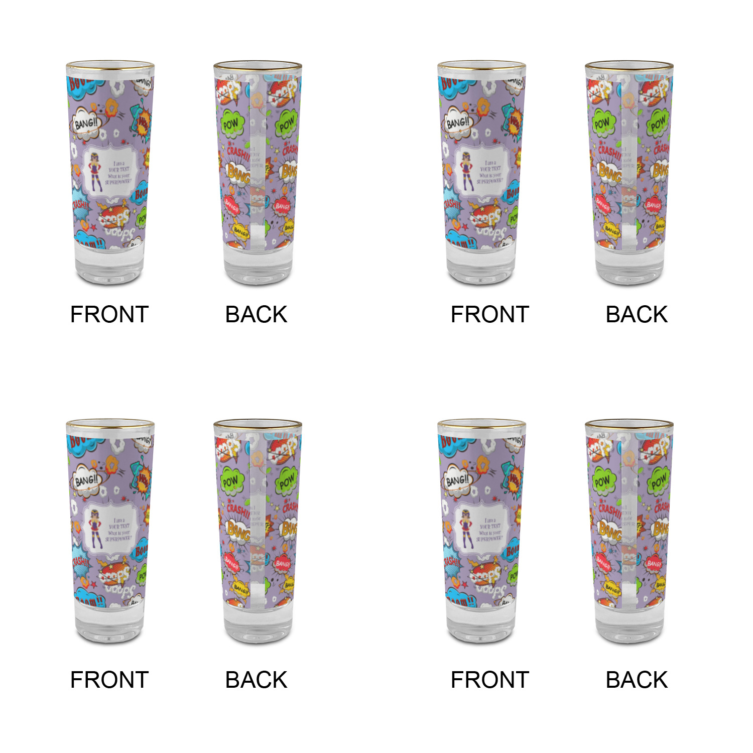 These glass shooter glasses are printed in full color with the design of your choice. These are a tall shooter 2 oz size and stand 4" tall. The print is a full wrap design to boldly display your personalization.