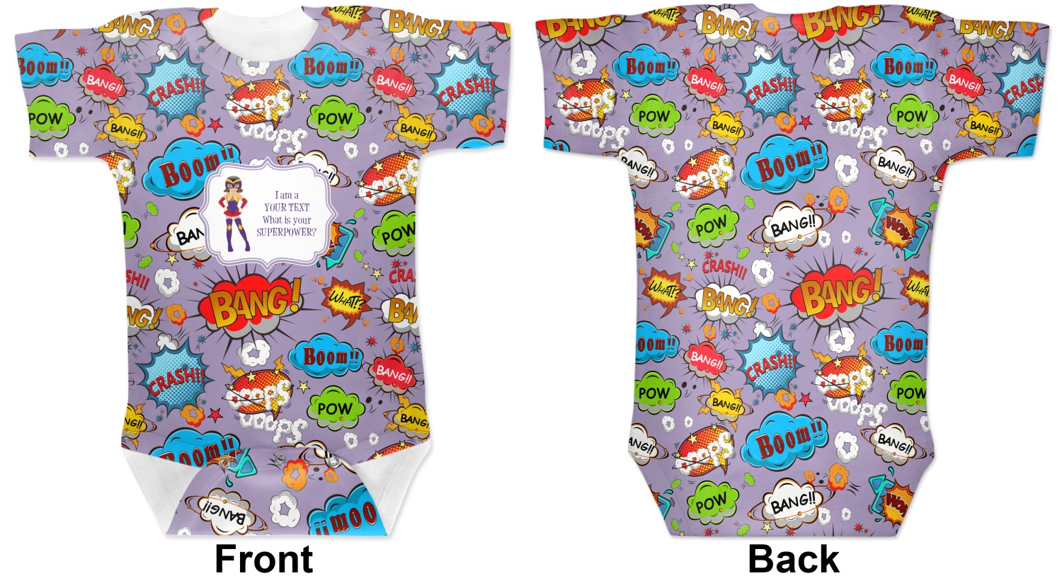 These cute baby bodysuits are made of stretchy, soft-to-the-touch polyester, making them very comfortable for your baby. These baby bodysuits also have snaps on the bottom to give easy access during changing times. Your personalization covers the entirety of this custom baby bodysuit, but the interior is white in color. As these are unisex baby bodysuits, they will work perfectly as baby girl bodysuits and baby boy bodysuits!