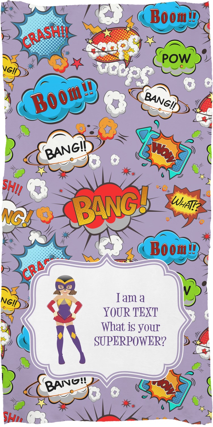These customized bath towels are slightly larger than your standard towel and are the ideal size for wrapping around your body. They measure approximately 60" x 30". Your customization is displayed across the entire front face of the towel, while the back is white.