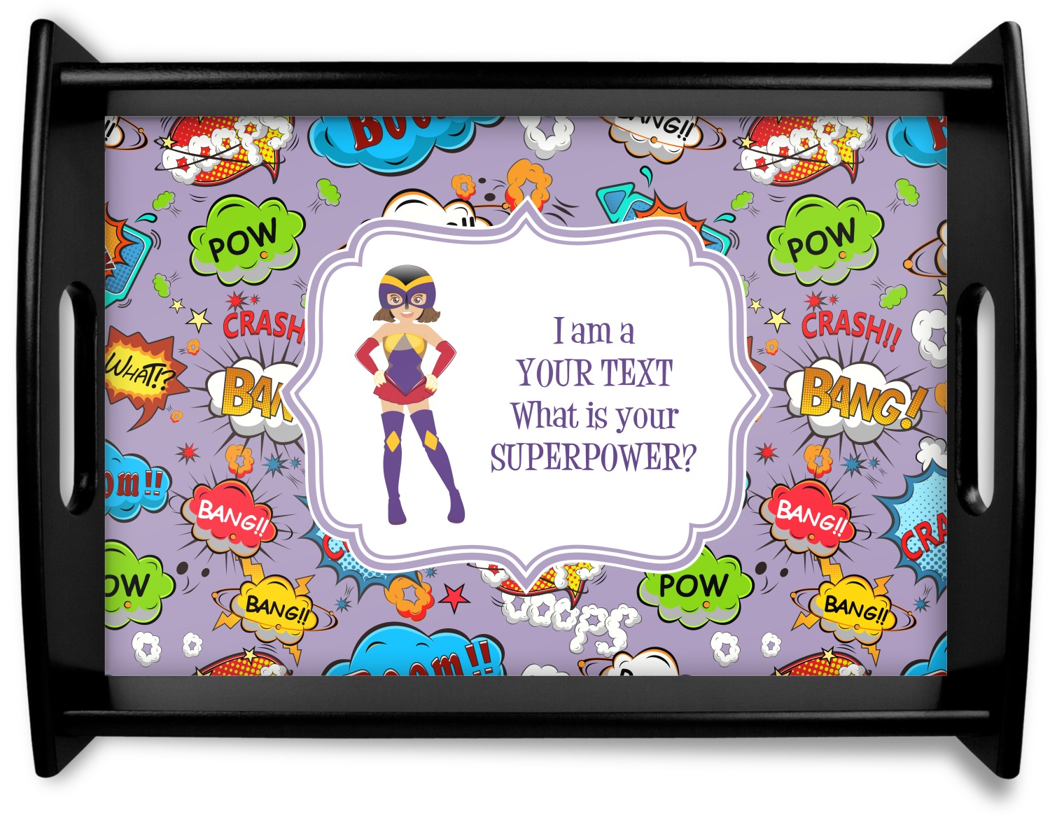 This serving tray with handles features square edges and two rounded sides, creating a very modern look. Each side is fabricated from a beautifully cut, natural wood. The bottom of the interior of the tray displays your customized design in bright, vibrant color. The tray is sold in both a black color and a natural wood look. Each variation of the wood serving tray has two sizes: Small, which is 14" x 10" x 2.25", and Large, which is 19.5" x 13.5" x 2.75".