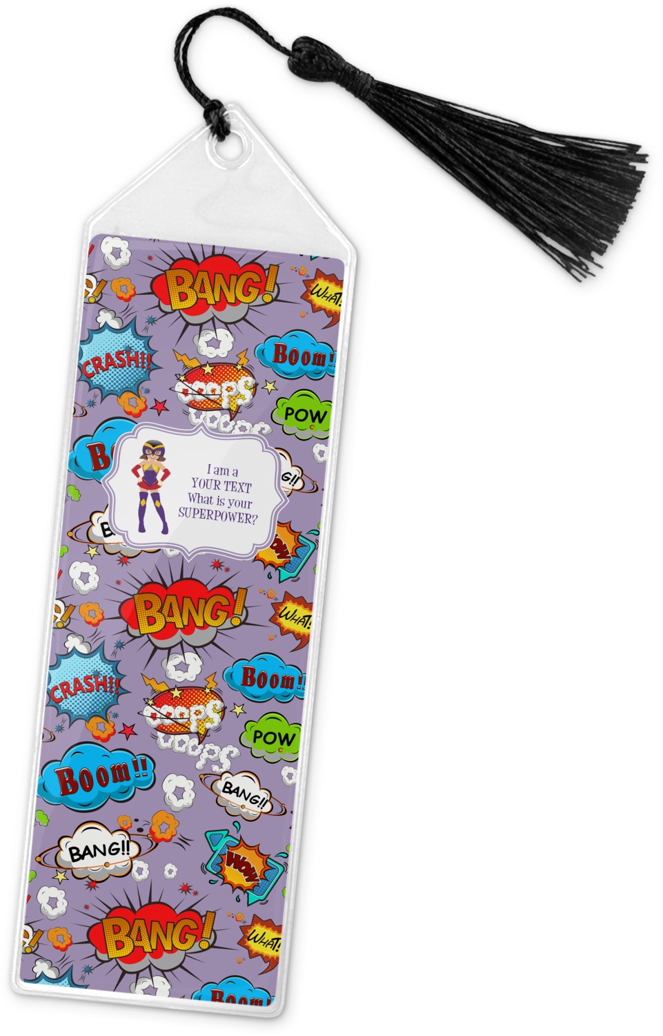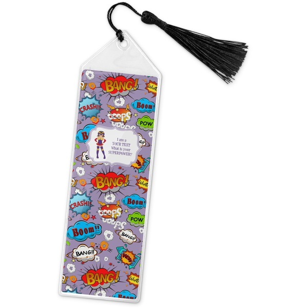Your personalized bookmark is made of a sturdy, clear vinyl, and is approximately 7.5" x 2.25". We display your personalization on vinyl inserts that are placed on both sides. Accompanying each book marker is a black, fringe tassel that attaches to the reinforced, triangular header.