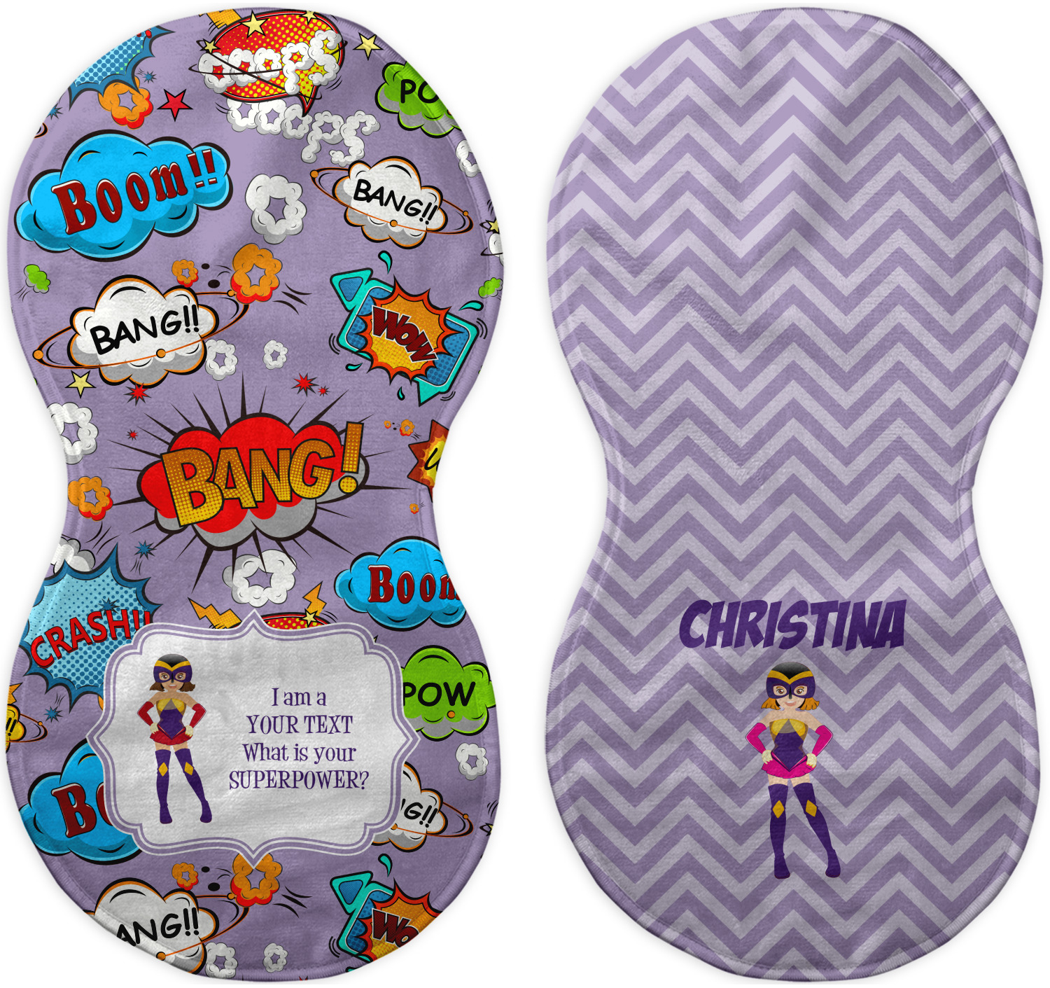 Choose your baby burp cloth from our two styles - Fleece (rectangular) or Microfiber Velour (peanut shape). The lightweight and absorbent design makes each burp cloth multipurpose; use them as a burp pad, a lap pad, a changing table, or a spare cloth to clean up any baby mess. Your customization is displayed across the front with baby-safe ink to ensure extra comfort with a white backing.