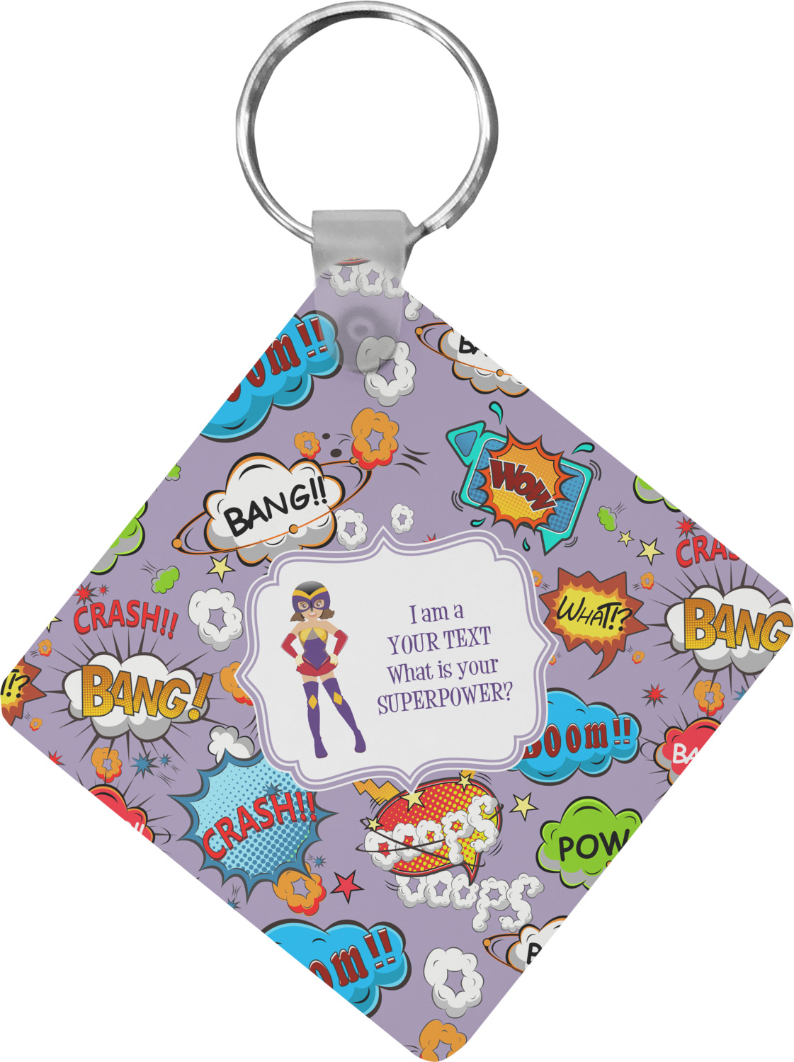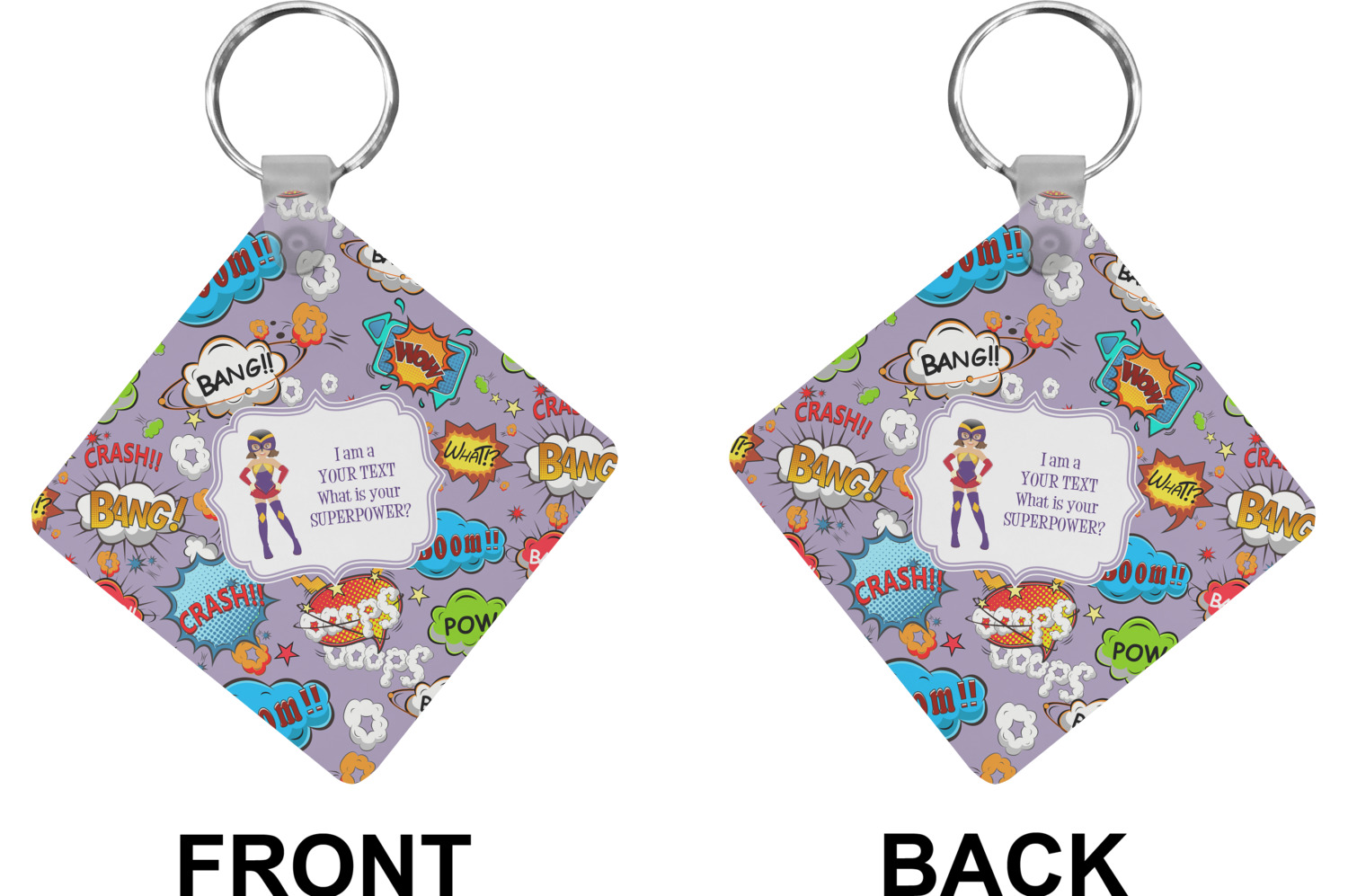 Our personalized keychains attach to the included metal, split key ring with a plastic, removable snap. Since a metal ring is included with your purchase, you have the liberty to keep your keys together on the ring, with or without your unique keychain. We offer this keychain in three different shapes: circle, heart, or diamond. We print your personalized design(s) on both sides of the key chain, and the surface has a glossy, reflective finish that only emphasizes your design. Each keychain is approximately 2.25 by 2.25 inches.