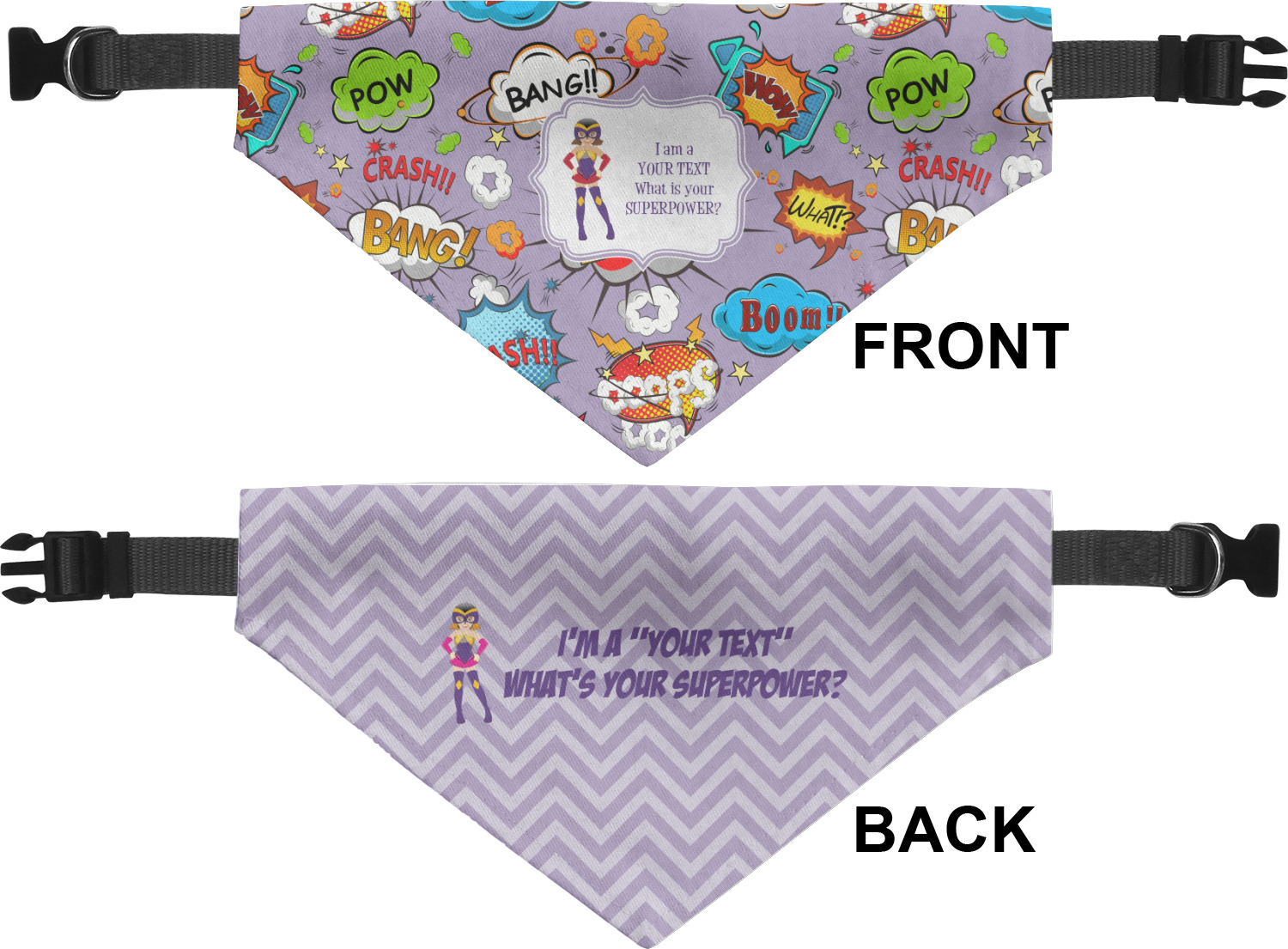We print the front and back of these dog bandanas with your customized design. The bandana itself is made from a durable polyester, sewn together with a gap large enough to accommodate any collar. Regardless, the bandana includes a plain black, canvas collar with plastic snaps, that can easily be removed if desired. These dog bandana collars are available in four sizes: small, medium, large, and extra large. Please see our sizing chart for more information regarding the dimensions of each size.