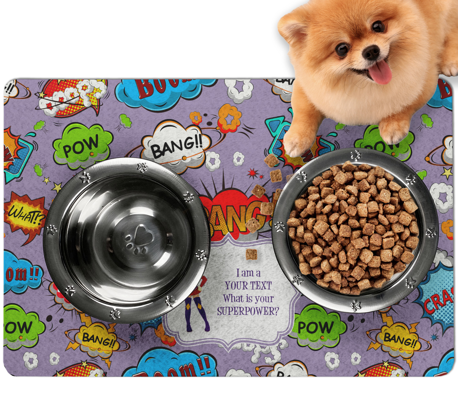 This dog bowl mat, fabricated from polyester, proudly displays your customized design on its top, while its bottom includes a non-slip rubber. This feature allows it to remain firmly in place, even when your dog spills his/her water. With 3 sizes available (18" x 12", 24" x 18", 30" x 24"), the pet food mat has ample space for both a food and water bowl for any sized dogs. Though specified for dogs' use, these mats are also a splendid option for cats.