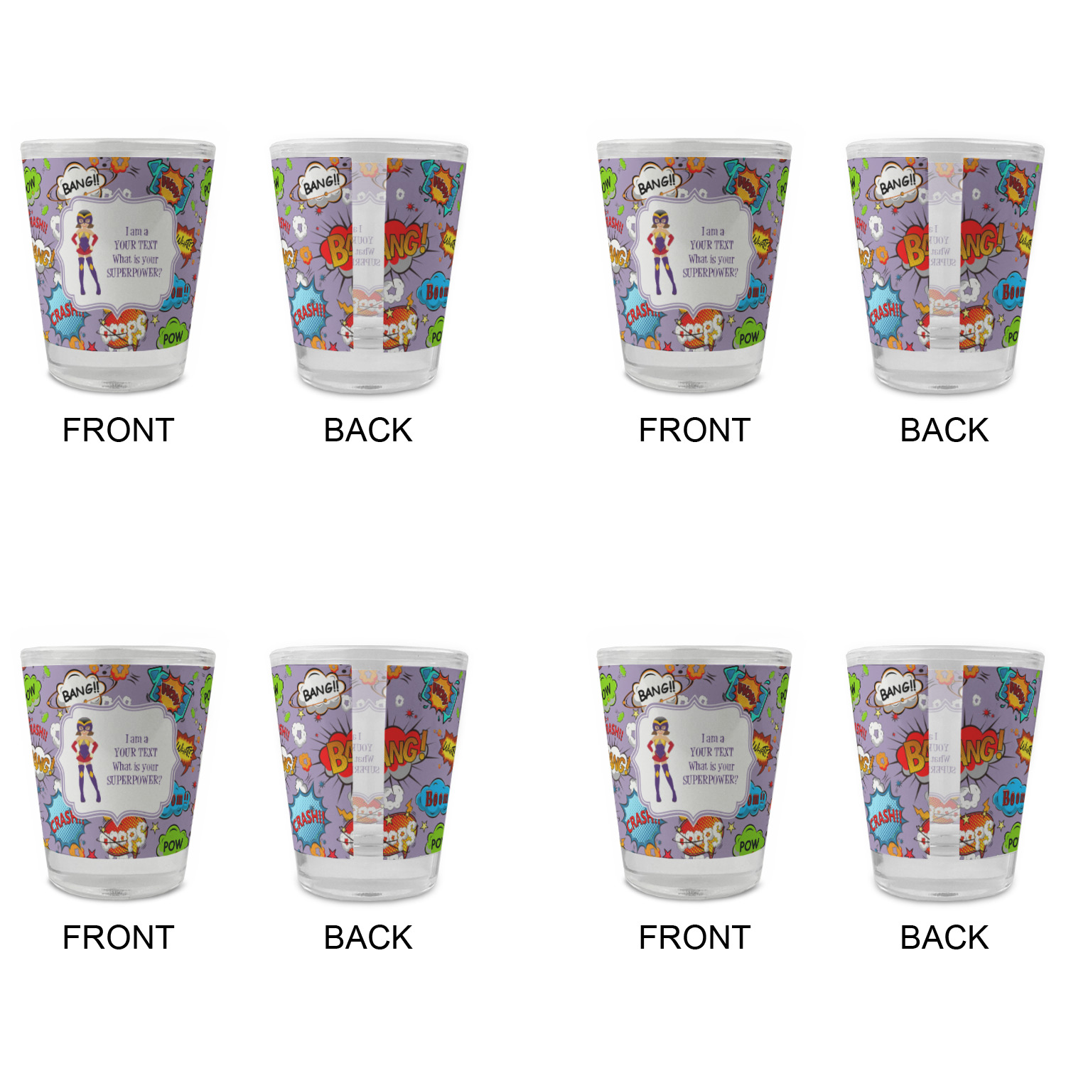 Made with frosted glass, these shot glasses are printed in full color with the design of your choice. They are a standard 1.5oz shot glass and are 2.4" tall. The print is wrapped around the shot glass in a full wrap and boldly displays your customization.