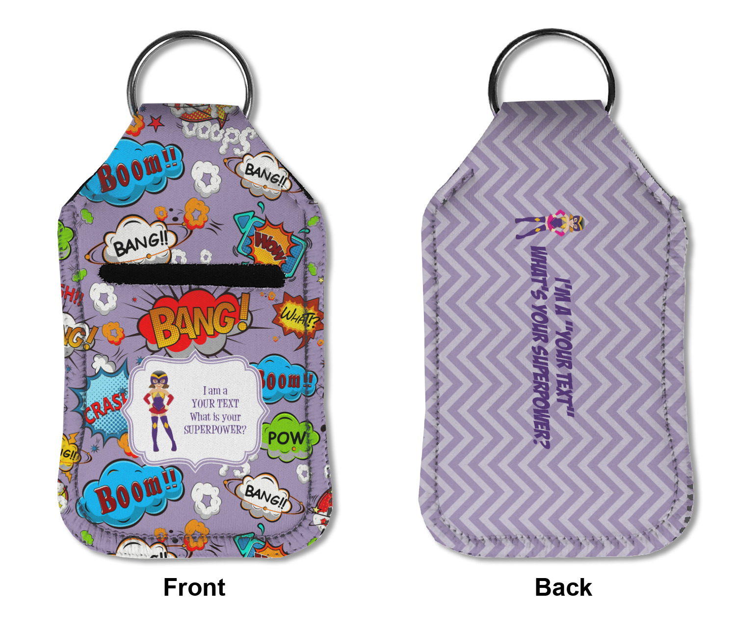 Each hand sanitizer holder comes with its own empty travel-sized, refillable hand sanitizer sure to fit snug in your customized sanitizer case! Our hand sanitizer cases are a durable, yet soft neoprene material sure to last any daily activities or travel agenda. Customize and personalize a hand sanitizer bottle holder with one of our two sizes - small (4.25" x 2.25") or large (5.5" x 2.5"). Each travel sanitizer holder comes with a keyring for attachment on bags, keys, or more!