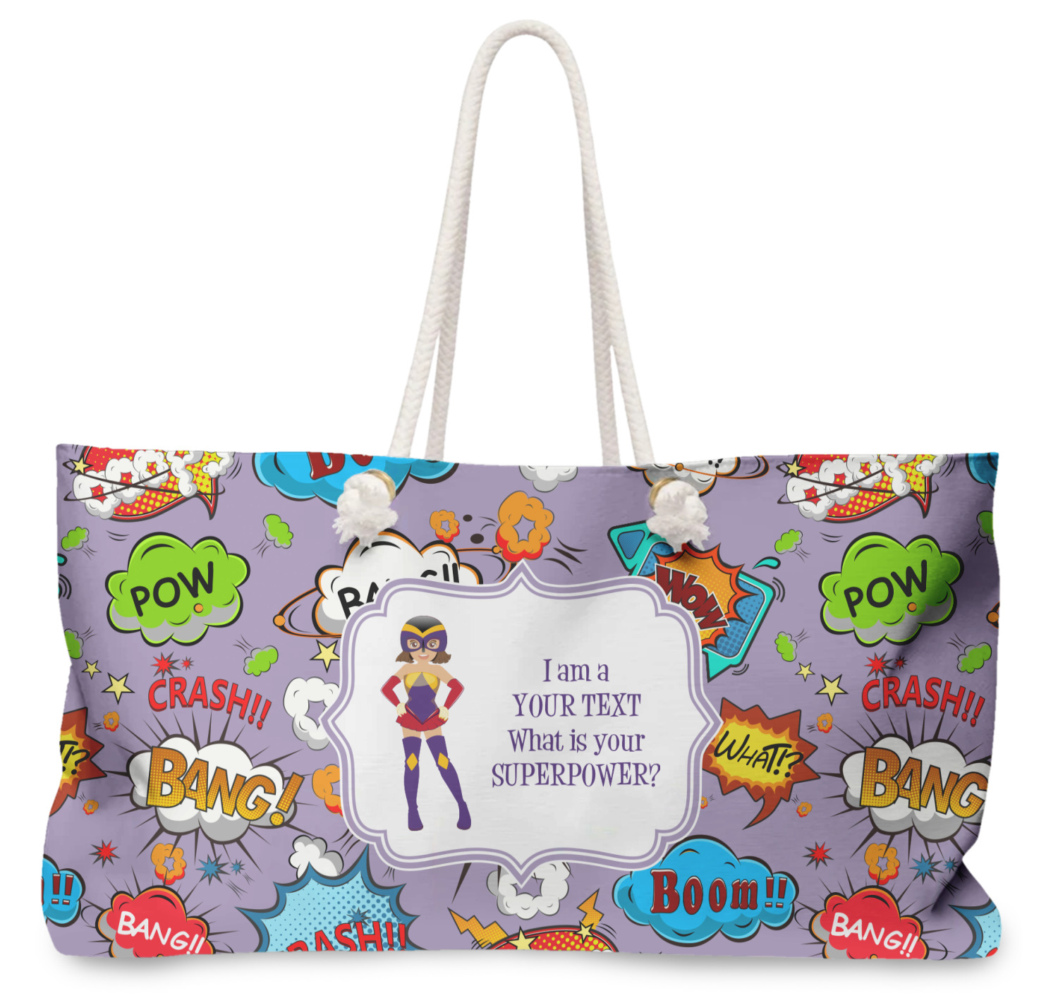 Our oversized weekender tote with rope handles is perfect for your weekend at the beach or on the town. This large tote are 24" W X 13" H, with a 5" gusset and a 27" thick rope handles with a knot that is put through a grommeted brass hole.
