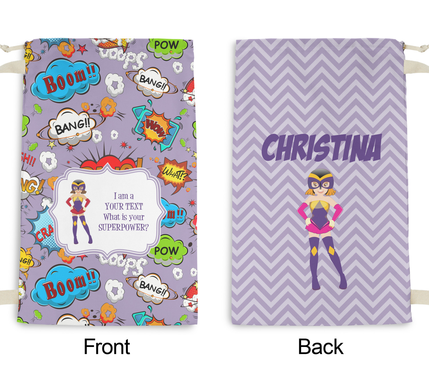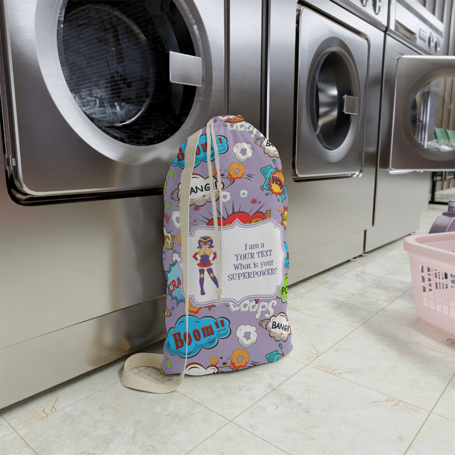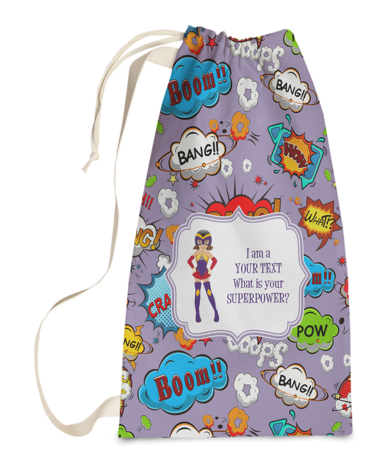 Carry your laundry in style with these customized laundry bags. Available in two sizes, featuring a natural colored woven strap and a cinch cord, these bags hold a lot of clothes or anything else you want to fit in them.