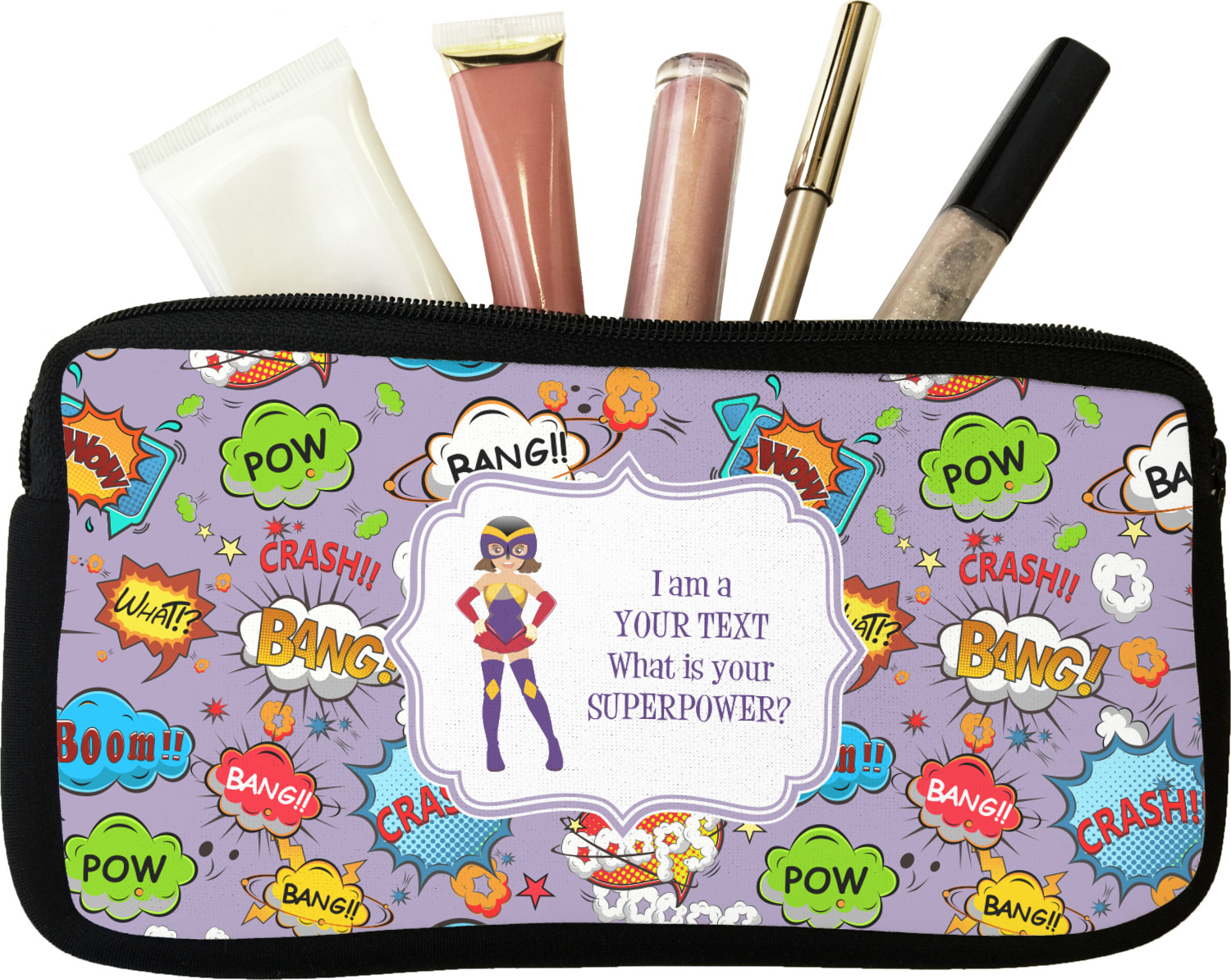 Our personalized makeup bags are available in many different designs, patterns and colors - so you are sure to find one that will love. They are made of neoprene (same material as wet-suits) and thus are water resistant, so spillages in your makeup bag will not end up all over you purse. They are customized on one side and are black on the other side and the zipper is black as well.