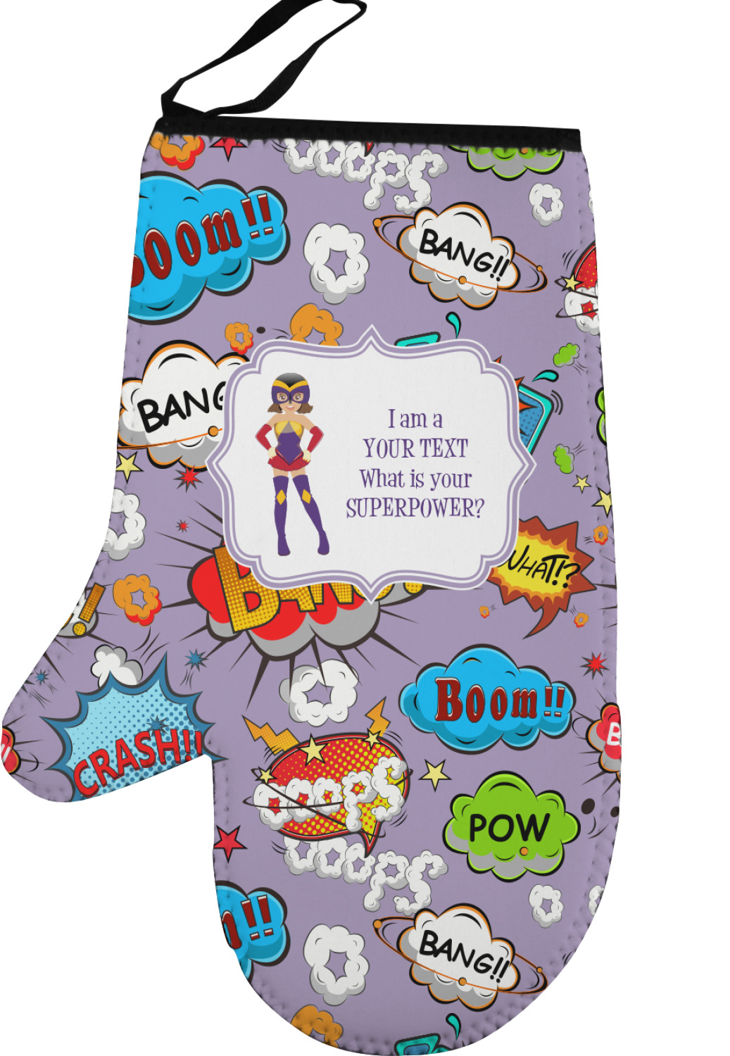 Our oven mitt gloves are made from a durable neoprene and feature a textured, rubberized surface on the palm's side for an easy grip. A strong stitch connects the neoprene and rubber, increasing the durability of this mitt. These oven gloves are spacious, and can accommodate both small and large hands. A thin, black loop is attached to the mitt's top, which can be used to hang and store the mitt. Your customization is displayed across the entire front of the neoprene surface. We sell both left and right hand models of these, separately.