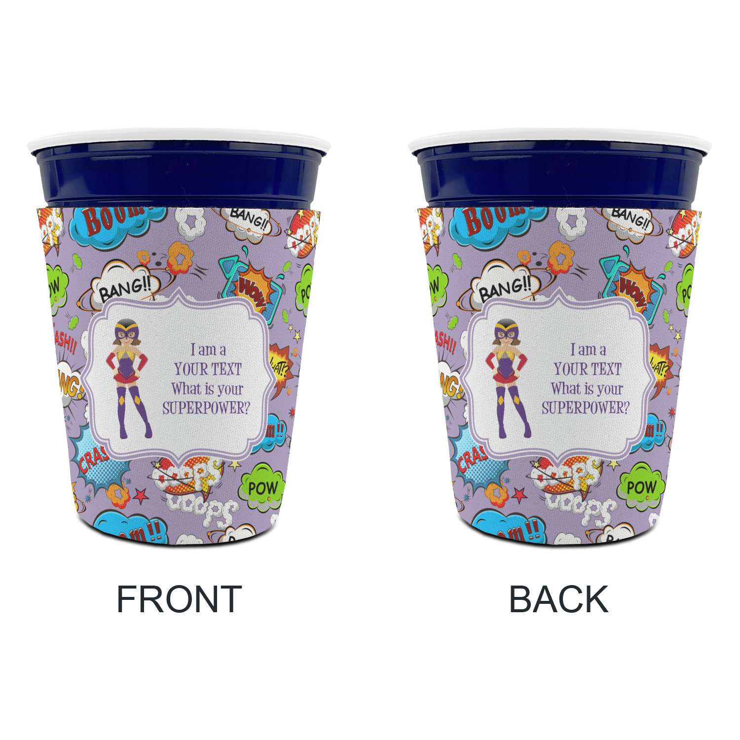 Made from neoprene with a polyester outer fabric and sewn seams, these premium quality party cup sleeves are very durable and will hold up to heavy use. They are available in 2 styles - with a bottom or just a sleeve to go around the outside of the tapered cup. The sleeve covers are about 4" tall and cover about 90% of the classic 16 oz. Solo cup.