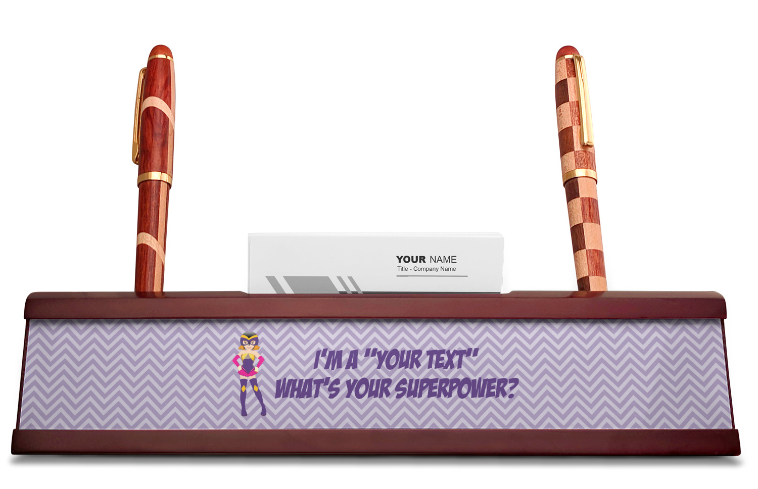 Your desk name plates are crafted from a high-quality, dark-cherry mahogany. At approximately 9.5 by 1.875 by 2.5 inches, this name plaque will fit perfectly, front and center, on your desk. Your customization spans across the entire face of the nameplate. Behind the nameplate lies a skinny slot that can fit approximately 15, traditionally-sized, business cards. You can also store your writing utensils on either side of this custom desk name plate.