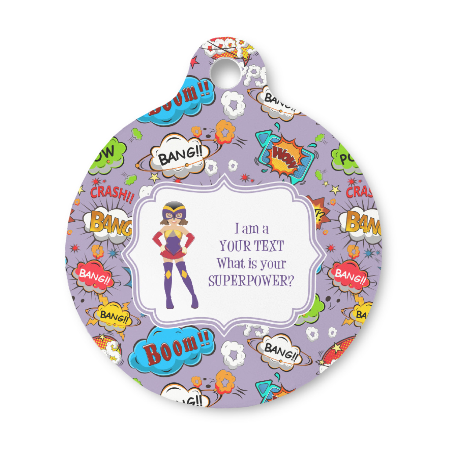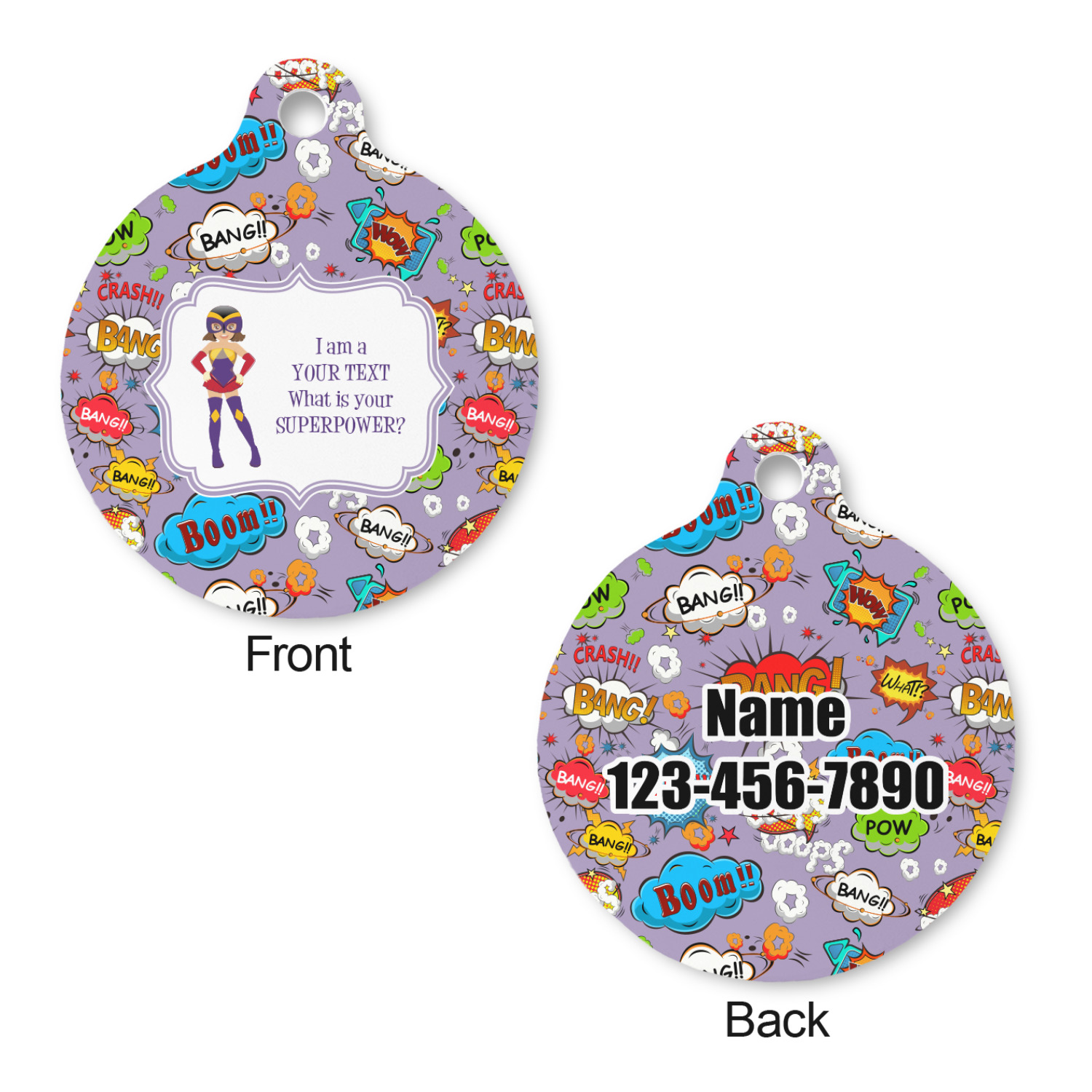 Go ahead; skip the monotony of plain pet ID tags with your very own, customized & personalized, round pet tag! This pet ID tag, fitting for both cats and dogs, will catch the eye of any onlooker (humans, canines, and felines, alike!) and accentuate your pet's individual personality.