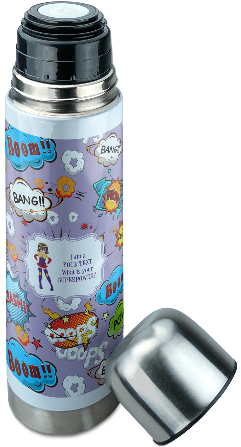 Manufactured from stainless steel, this thermos is built durably and double-walled insulated to preserve the temperature of your drink for hours. It also features a screw off lid that is made to also function as a small cup. Upon unscrewing this part of the thermos bottle, a pop-open, pour feature emerges. This feature allows you to slowly pour your beverage into your lid, ensuring a steady, controlled pour into your lid or other cup. With a capacity of 25 ounces, these large thermoses can hold several servings of your favorite beverage. Your customization is displayed all around the bottle with bright, vibrant color.