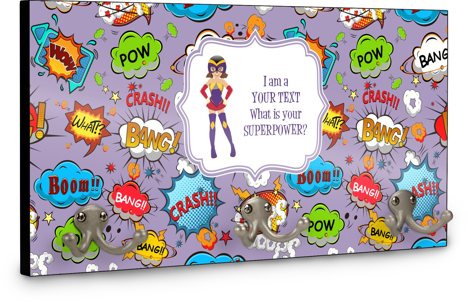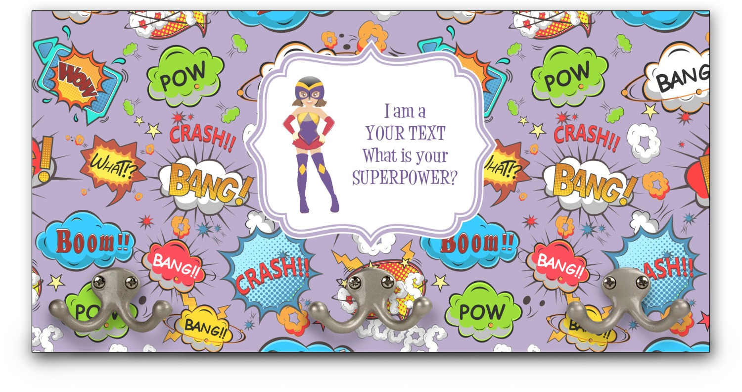 This coat rack is the perfect way to add some personality to your wall or entryway. The board is made of a strong maple that is approximately 16" x 8". The three 2-prong hooks are a sturdy metal that have three screws attaching them to the board. Your design is printed right onto the front of the board while the back and sides are a simple black.