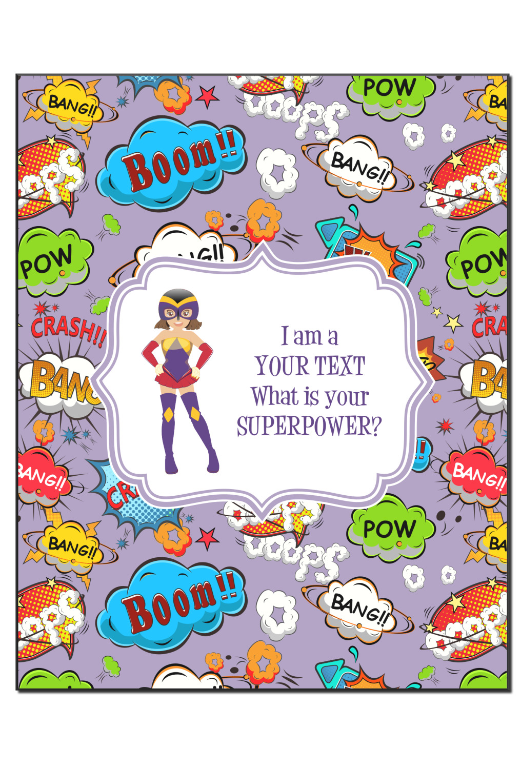What is your SUPERPOWER? We are developing SUPERPOWER series of designs and this is the first one of the series. In this one you, we have graphics of superheroes (we have many in our systems - men, women, boys & girls) and your choice of text besides the graphic. We LOVE the saying I am a - "your text here" - e.g. supermom, superdad, superkid, surgeon, doctor, nurse etc, followed by what is our SUPERPOWER?