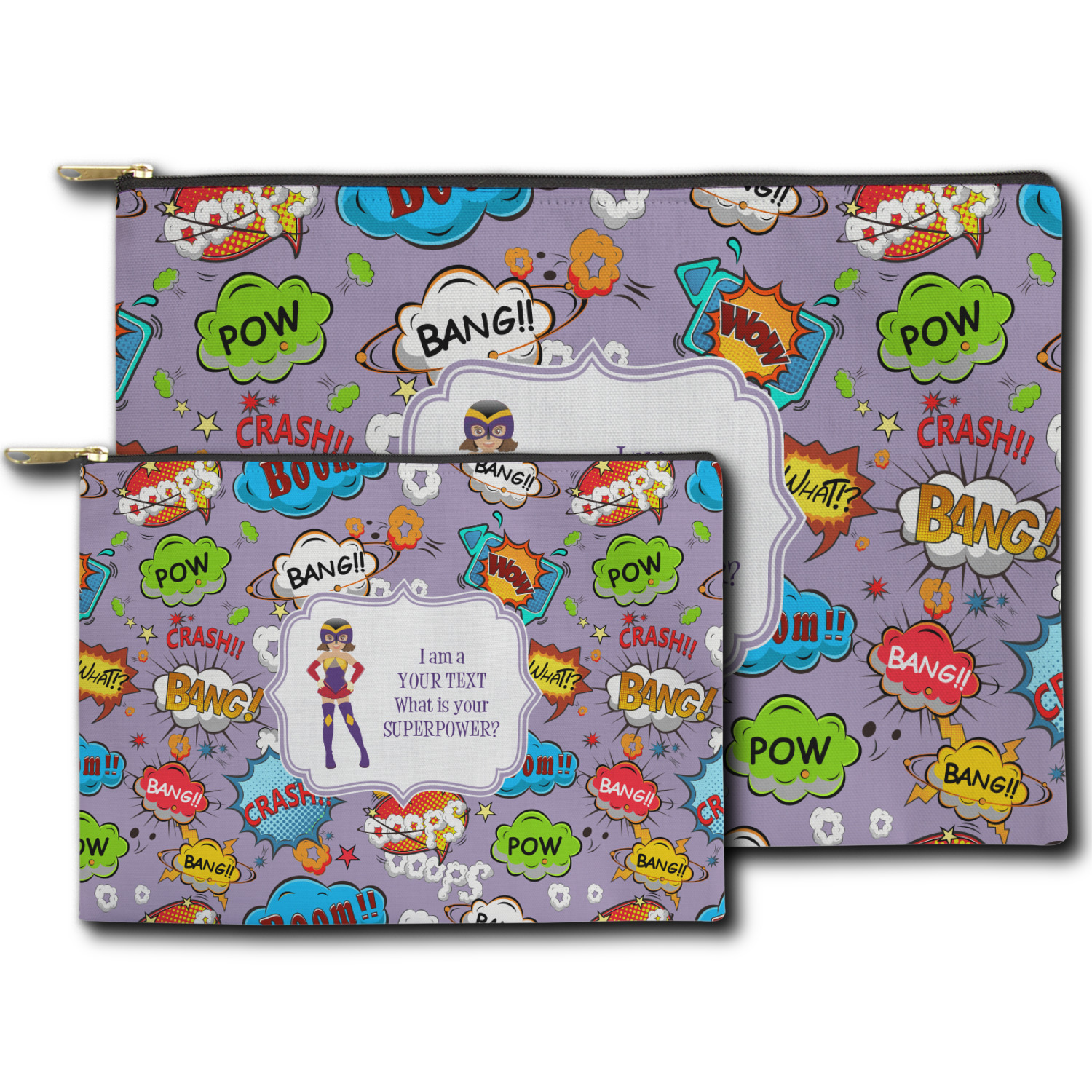 Our zippered pouches are available in two sizes - small: approx 8.5W"x6H and large: approx 12.5Wx8.5H. The pouches are made from a soft & durable canvas fabric that is printed on the outside with your design; the inside has a fused black lining. The printed canvas fabric is then cut and the pouches are sewn right here in the USA. The zipper itself is gold in color and has a round hook.