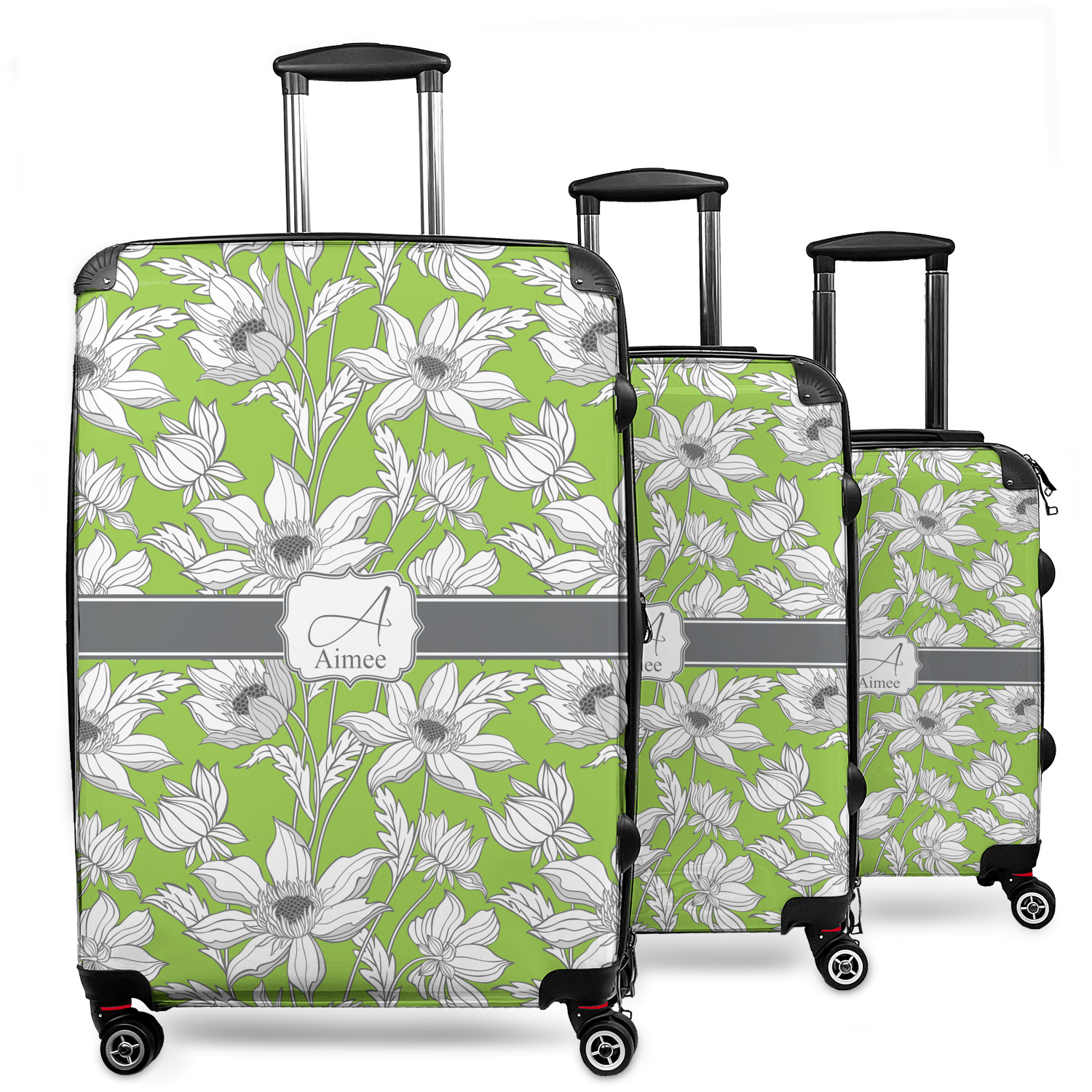 Your suitcases will be personalized on the front, while the back and sides are a sleek charcoal color. On the side opposite of the side handle there are rubber feet to allow it to safely lay on its side on a luggage belt. These are a lightweight hard shell luggage option that will fit just about anyone's needs. The sizes and weights of each suitcase are below: