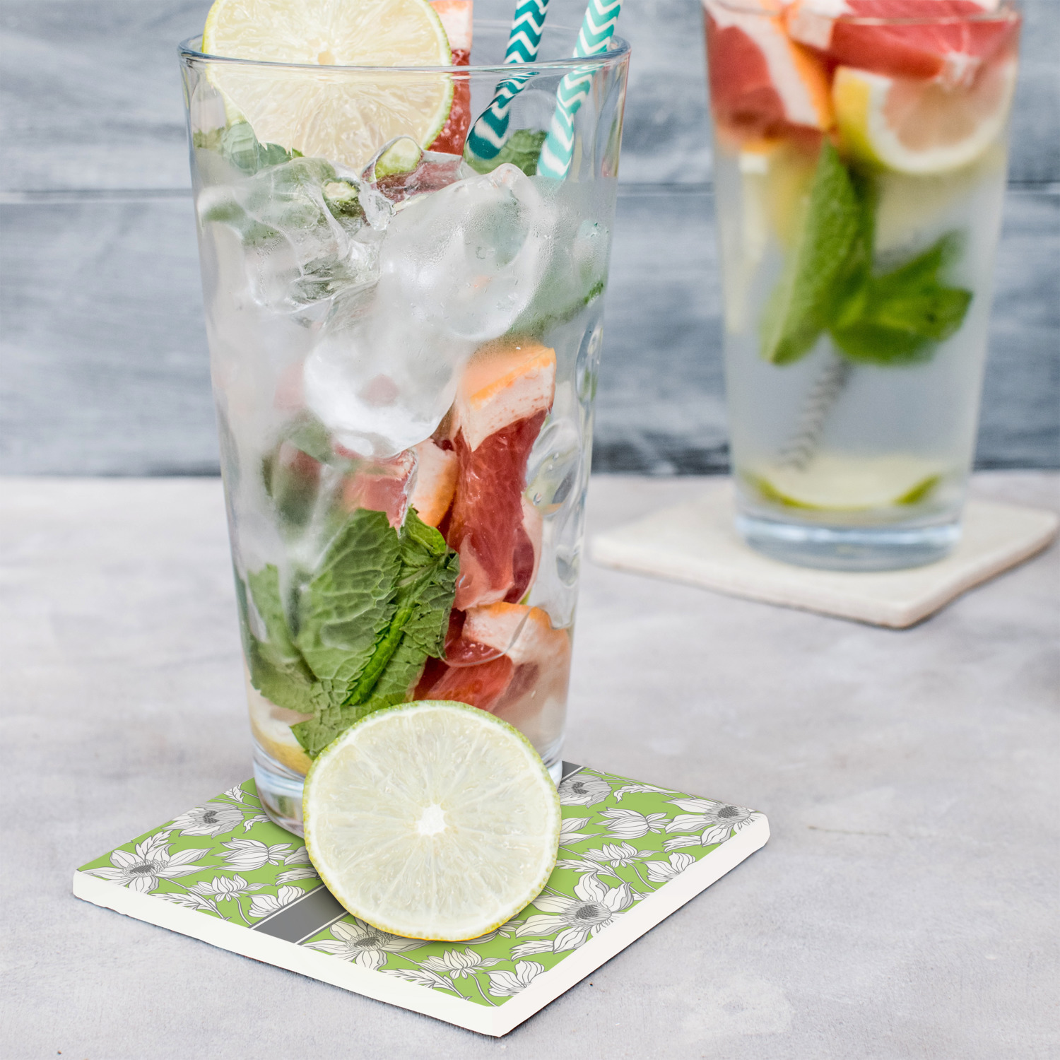 These customized stone coasters are perfect for use with beverages that are served in drinkware that "sweat". When cocktails, sodas, iced tea, water, etc. are served with ice in a regular glasses (non insulated glasses), they release condensation that drips down the outside of the glasses.