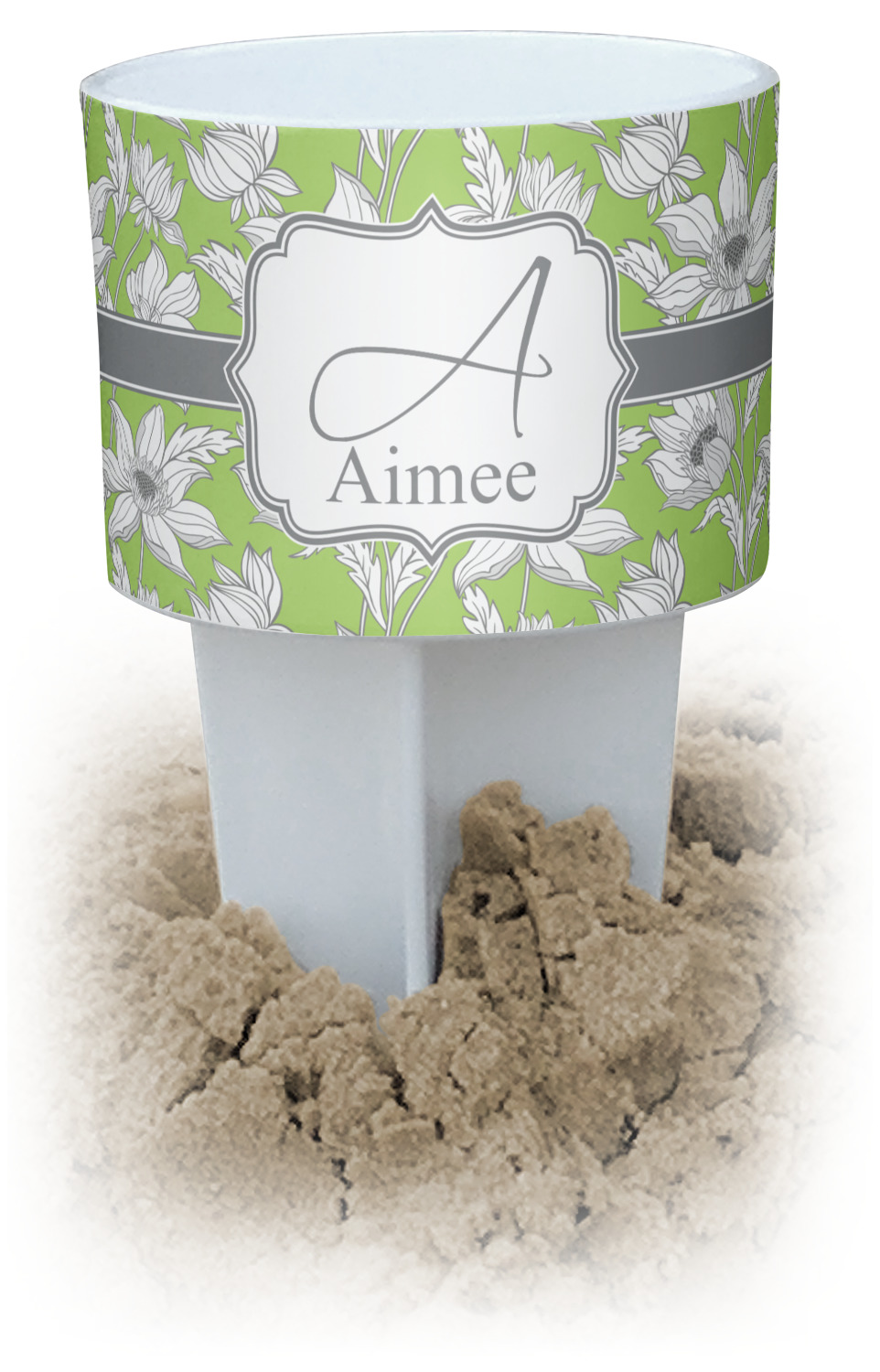 This cup holder has a large stake at its bottom that anchors it to the sand or ground below, while the cup holder rests above the stake. The entire drink holder is made of durable plastic and displays your customization around the cup holder portion. We sell these personalized beach spikers in two different colors: black and white.