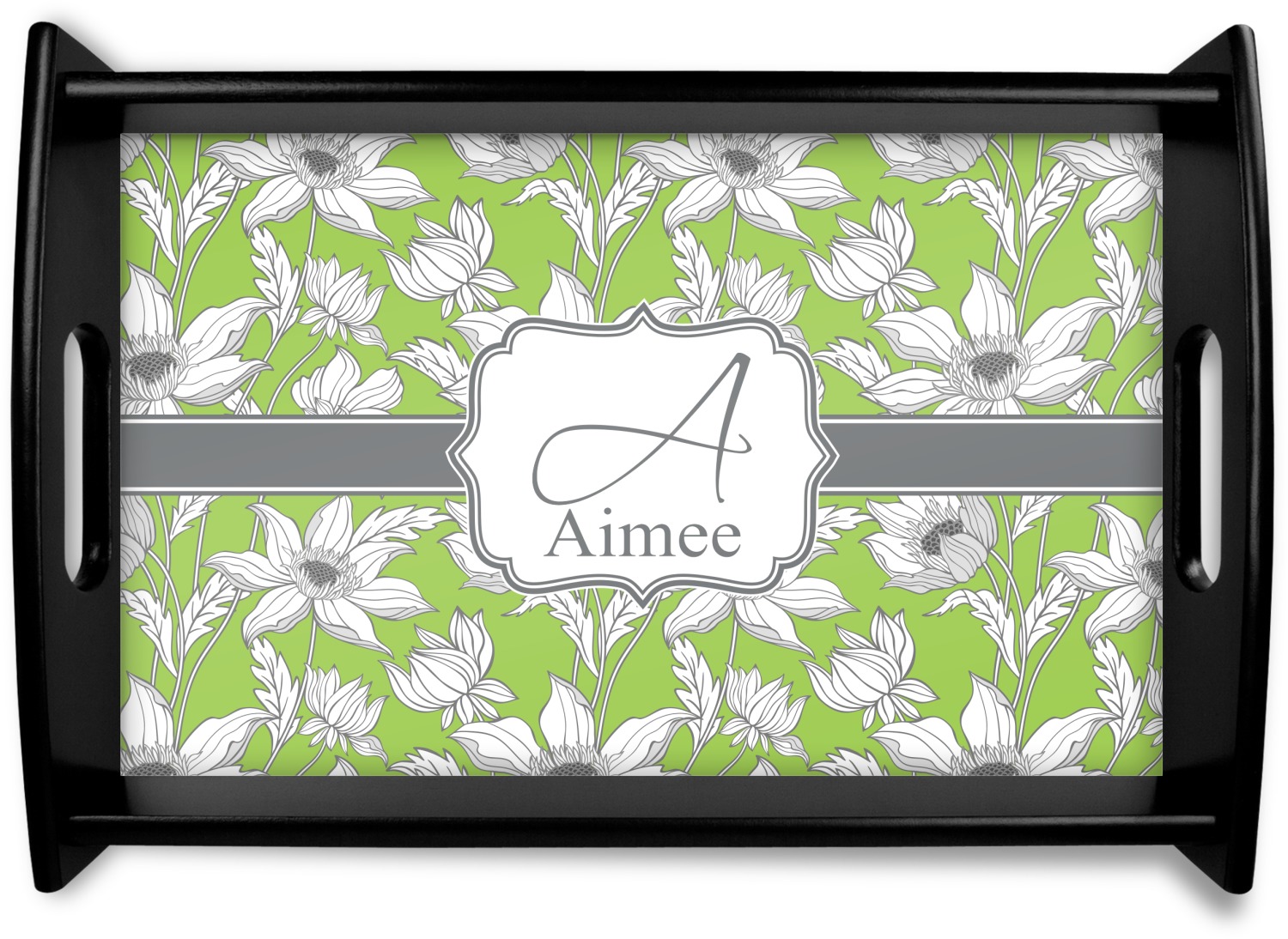 This serving tray with handles features square edges and two rounded sides, creating a very modern look. Each side is fabricated from a beautifully cut, natural wood. The bottom of the interior of the tray displays your customized design in bright, vibrant color. The tray is sold in both a black color and a natural wood look. Each variation of the wood serving tray has two sizes: Small, which is 14" x 10" x 2.25", and Large, which is 19.5" x 13.5" x 2.75".