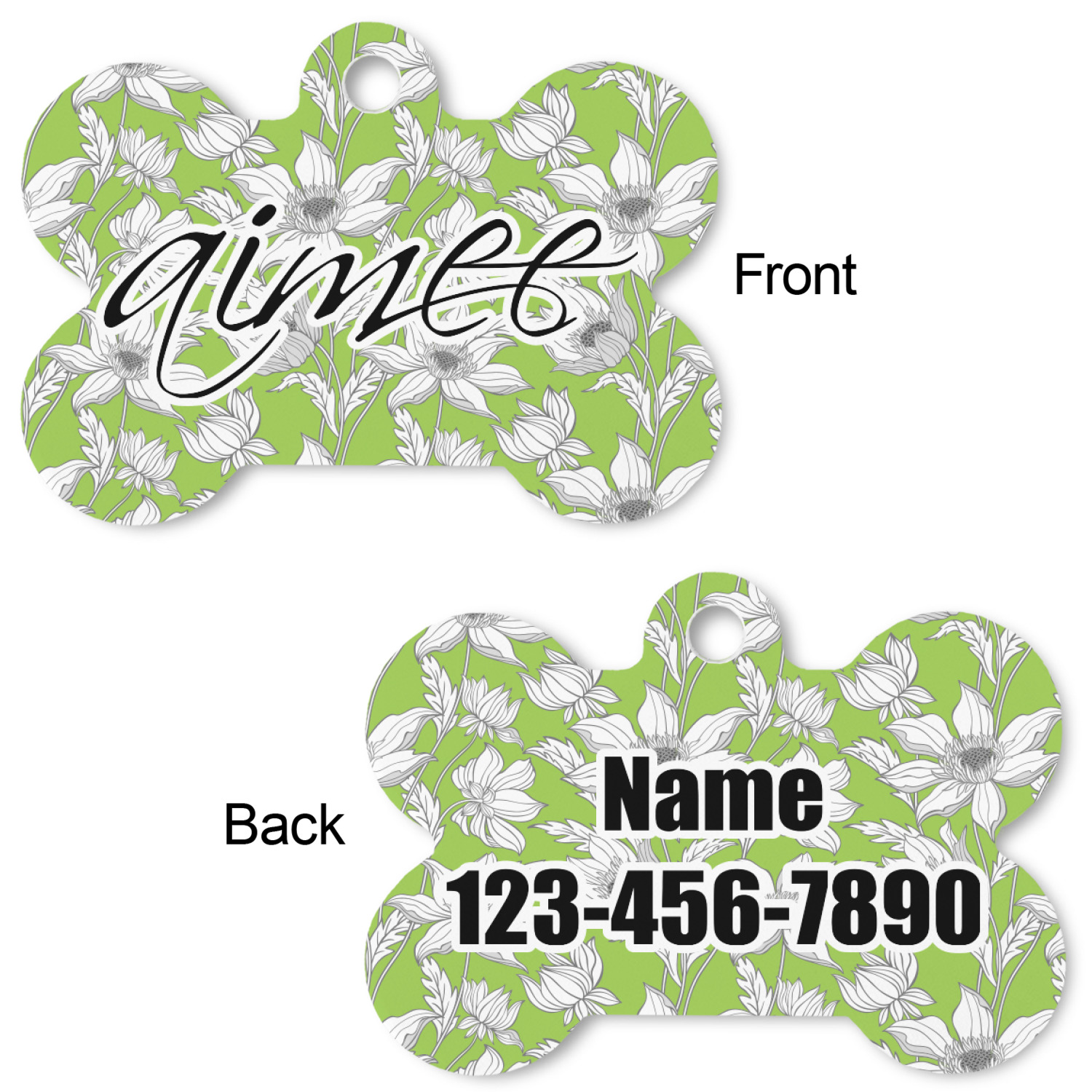 Our default design templates print your dog's personalization on the front and your contact information on the back; however everything is customizable, so you customize the patterns, the colors, the personalization, the contact information etc.
