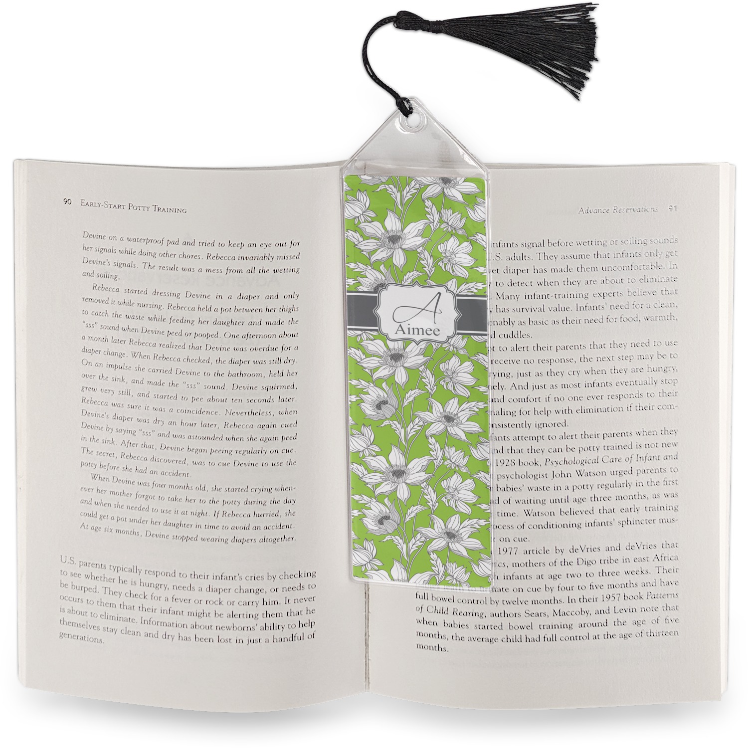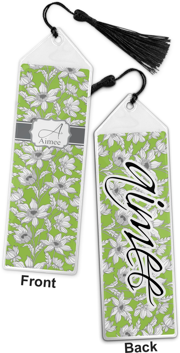 Your personalized bookmark is made of a sturdy, clear vinyl, and is approximately 7.5" x 2.25". We display your personalization on vinyl inserts that are placed on both sides. Accompanying each book marker is a black, fringe tassel that attaches to the reinforced, triangular header.