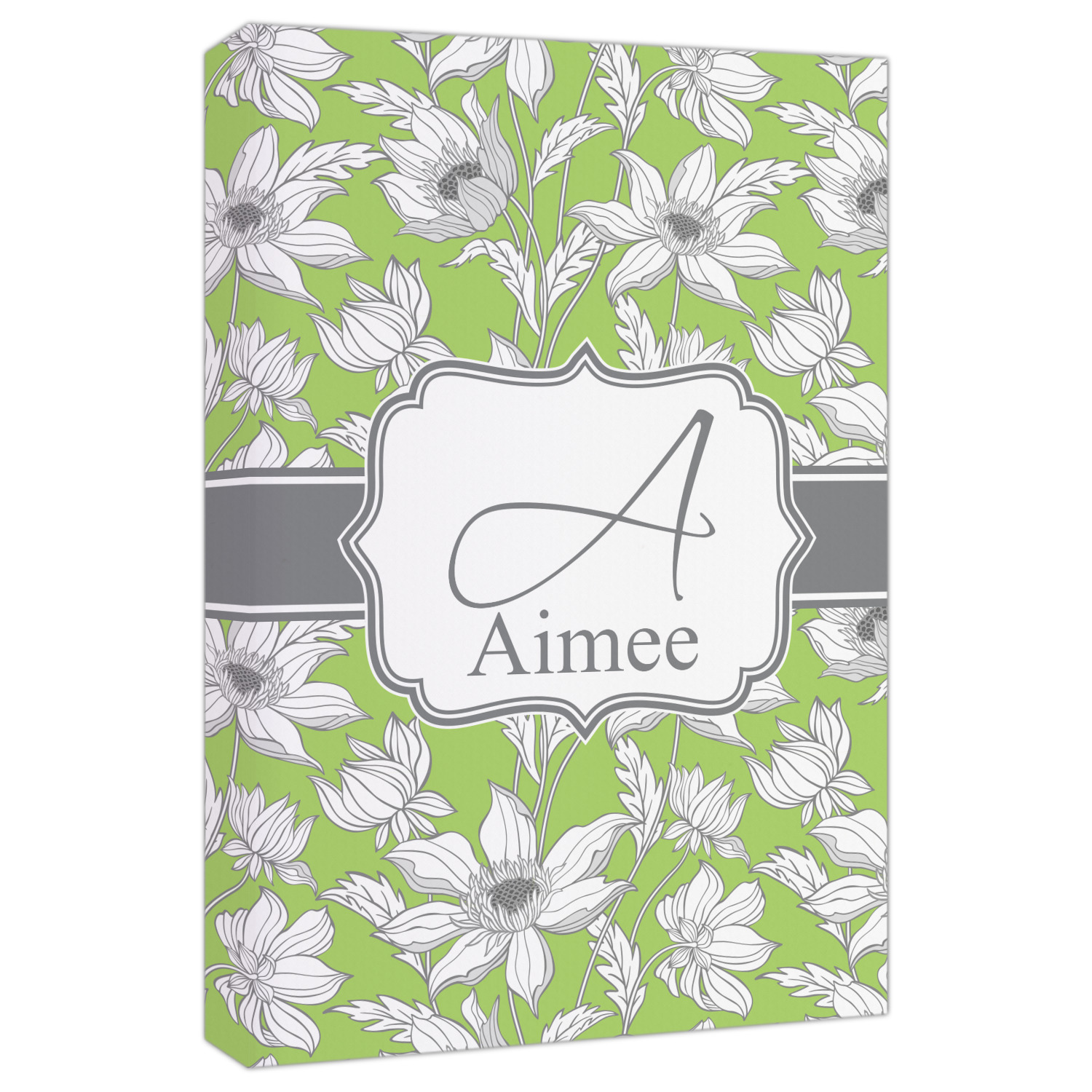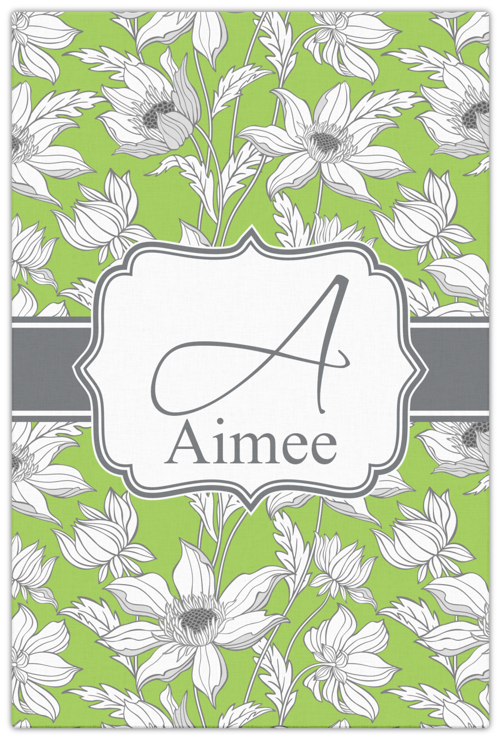 Sketches of long stem white daisies outlined in gray spring to life up against a green background. A white trimmed gray ribbon coordinates with a decorative label to showcase the personalization of your choice.
