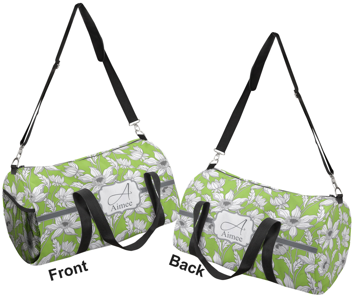 This duffle is a sturdy bag made of a canvas material. It comes in two sizes: Small (19"W x 9.5"H x 9.5"D) and Large (23"W x 12"H x 12"D). The bag is a cylindrical shape with a black adjustable strap and two handles. On one side is an elastic pouch to put a waterbottle or other small item. Your product will be sublimated with your design and is able to be designed on the front, back, and sides. Be sure to remember that the straps may cut into parts of your design if you upload your own artwork.